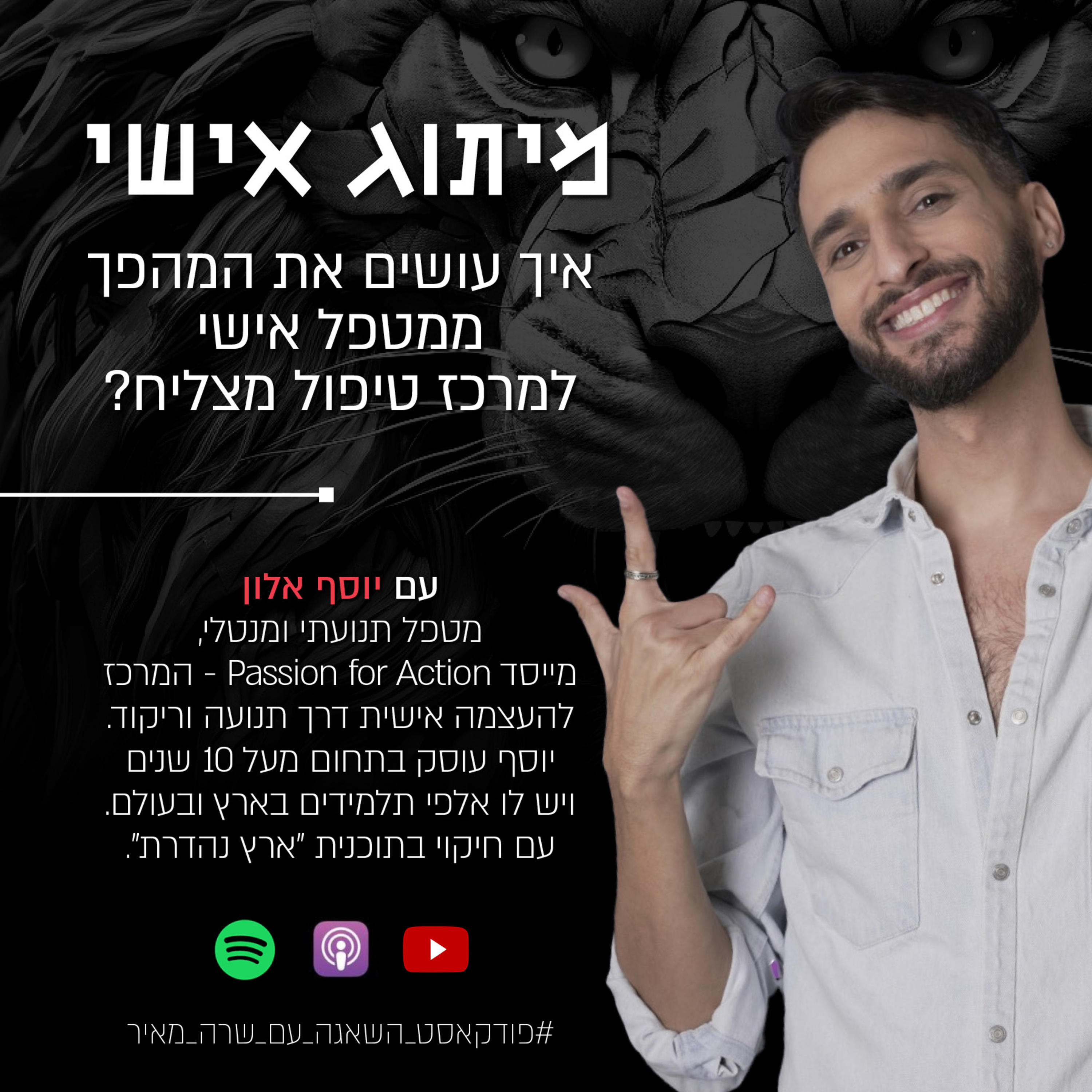 בפרק אני מראיינת את יוסף אלון, מטפל תנועתי ומנטלי המומחה במיקוד למציאת זוגיות, מייסד Passion for Action - המרכז להעצמה אישית דרך תנועה וריקוד. יוסף עוסק בתחום מעל 10 שנים ויש לו אלפי תלמידים בארץ ובעולם. עם חיקוי בתוכנית "ארץ נהדרת". עם השנים הפך את גישתו הייחודית לכלי אפקטיבי למציאת זוגיות ולשיפור אישי.