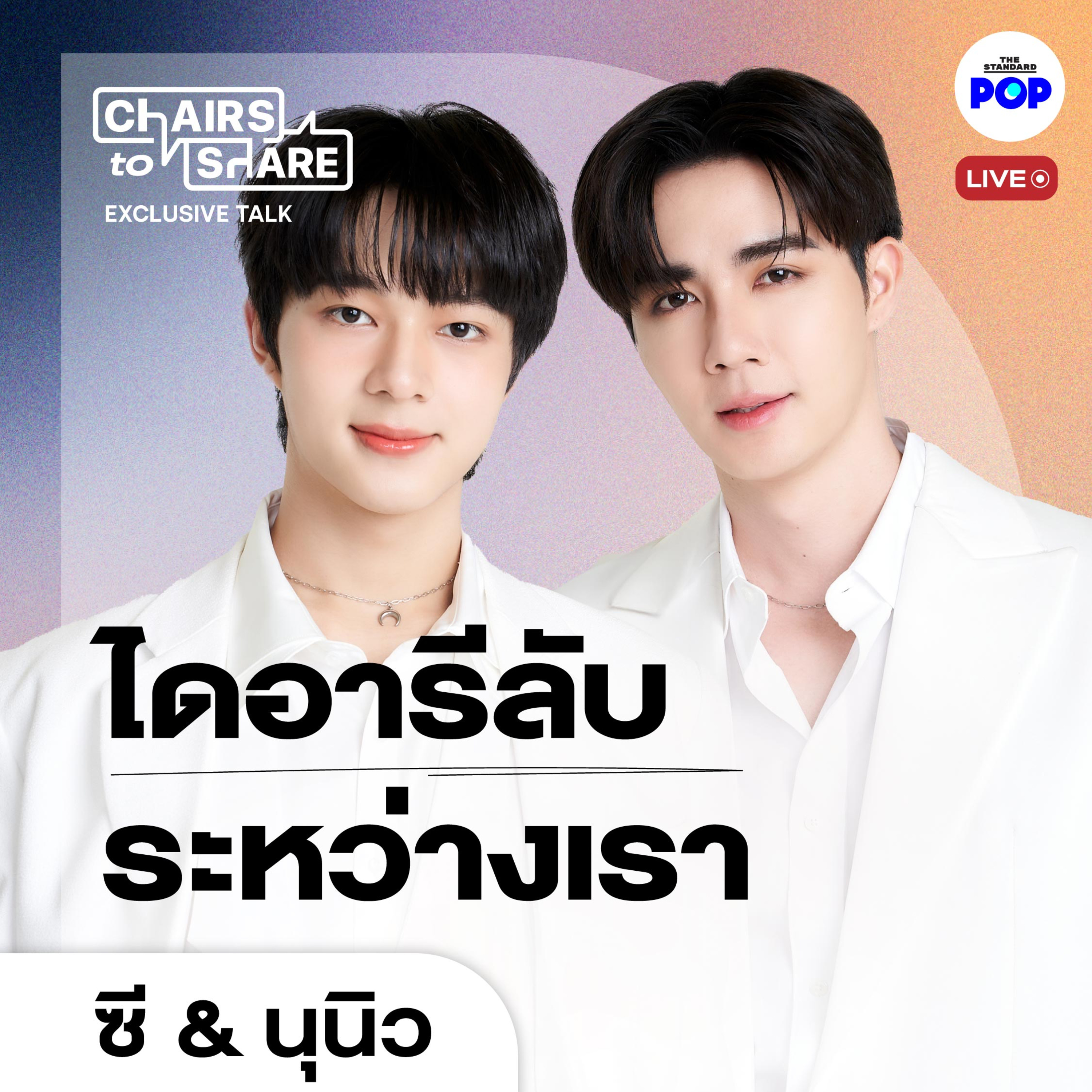 พลาดไม่ได้กับกิมมิกพิเศษตลอดรายการ ที่แฟนๆ จะไม่ได้แค่รับชม แต่ ‘ร่วมแชร์’ คำถาม ความรัก และความรู้สึกที่มีต่อซีและนุนิว ท่ามกลางบรรยากาศแบบใกล้ชิด ที่ส่งตรงแบบสดๆ มาจาก SCBX NEXT STAGE ชั้น 4 สยามพารากอน โดย THE STANDARD POP รายการ Chairs to Share