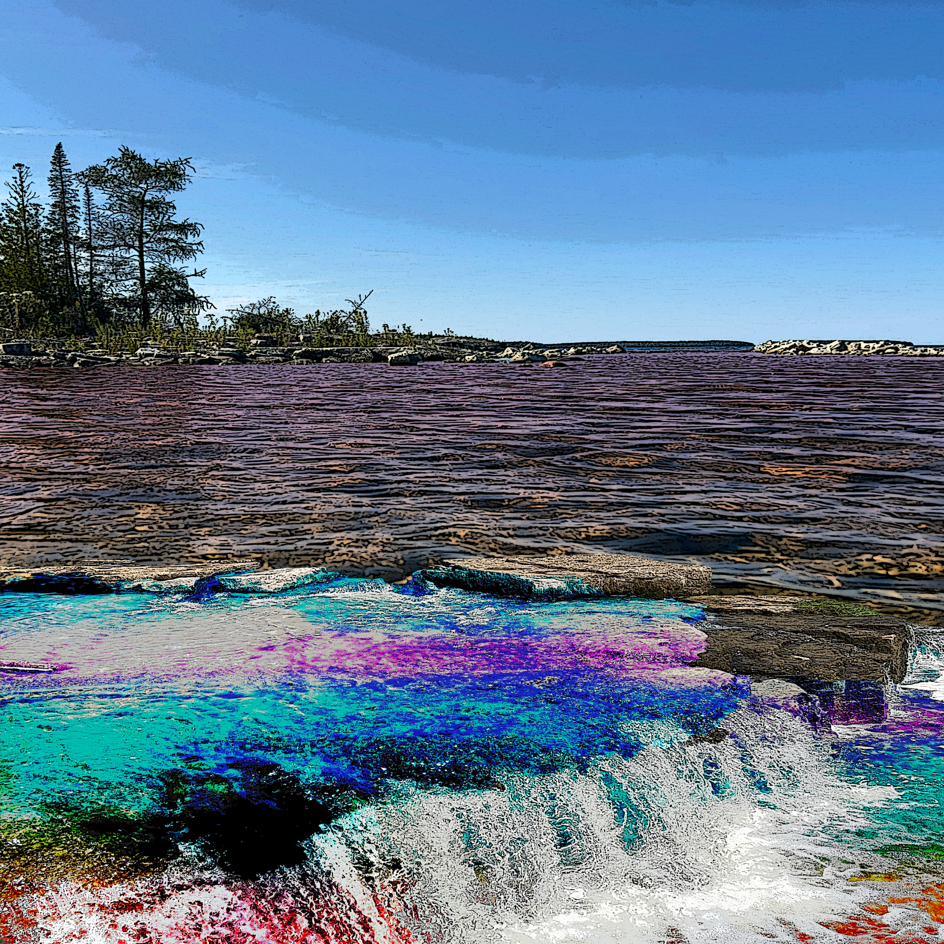 Water flowing down the river meets a group of rocks...
