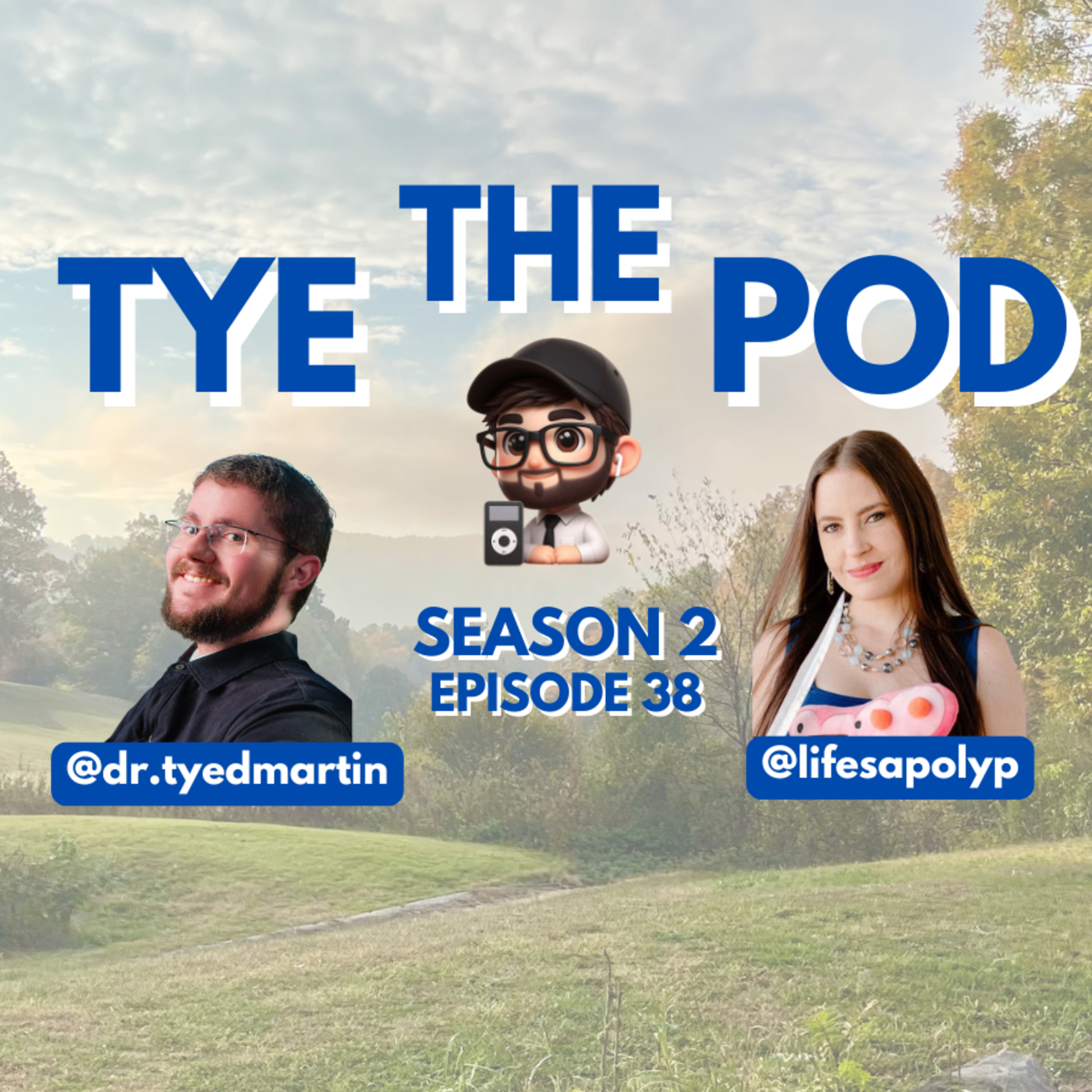 A podcast promo graphic with a scenic park background at sunset. The title reads: “THE TYE POD” in bold blue and white letters, with a cartoon podcaster icon wearing a black cap in the center. Below it says “Season 2 Episode 38.” On the left is a smiling man with glasses and a beard labeled “@dr.tyedmartin.” On the right is a woman with long brown hair wearing a dark top and holding a stuffed intestine plush, labeled “@lifesapolyp.”