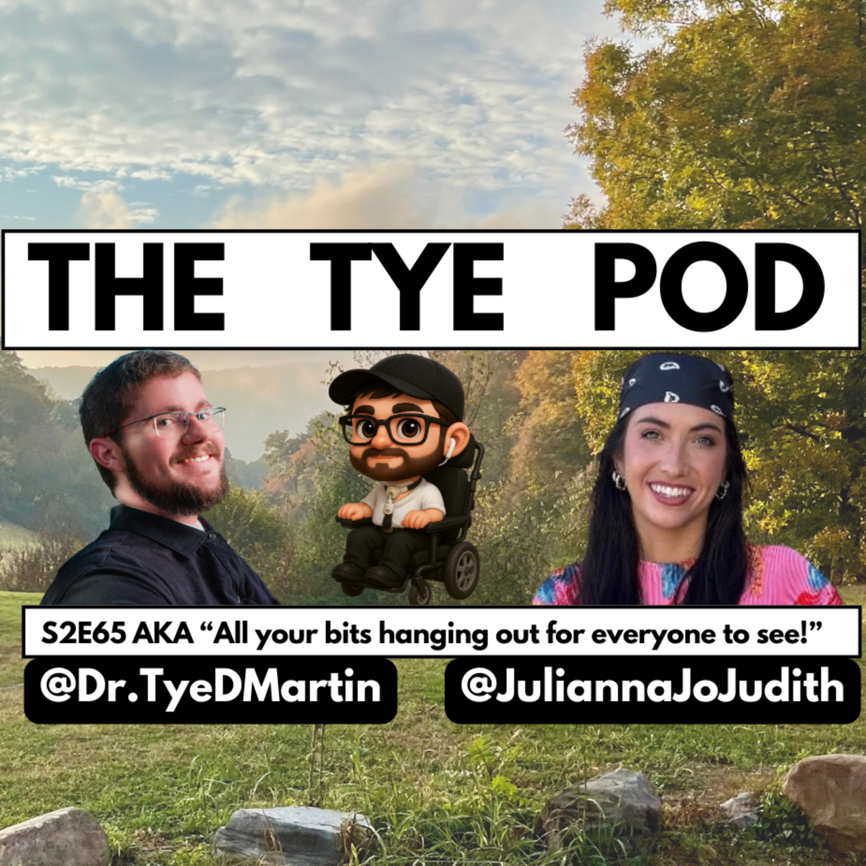 A podcast cover features a scenic outdoor landscape with a grassy field, scattered rocks, and tall autumn trees beneath a partly cloudy sky. Centered near the top is a bold white banner outlined in black with the text “THE TYE POD” in thick black letters. Below the banner are three figures: on the left, a smiling man with glasses, a beard, and short brown hair, wearing a black collared shirt; in the middle, a cartoon-style avatar of a person with brown hair, glasses, and a beard seated in a power wheelchair and wearing a black cap; and on the right, a smiling woman with long dark hair wearing a black bandana and a colorful tie-dye shirt. Near the bottom, text in a white box reads: “S2E65 AKA ‘All your bits hanging out for everyone to see!’” Beneath that are two black rounded tags with white text featuring social media handles.