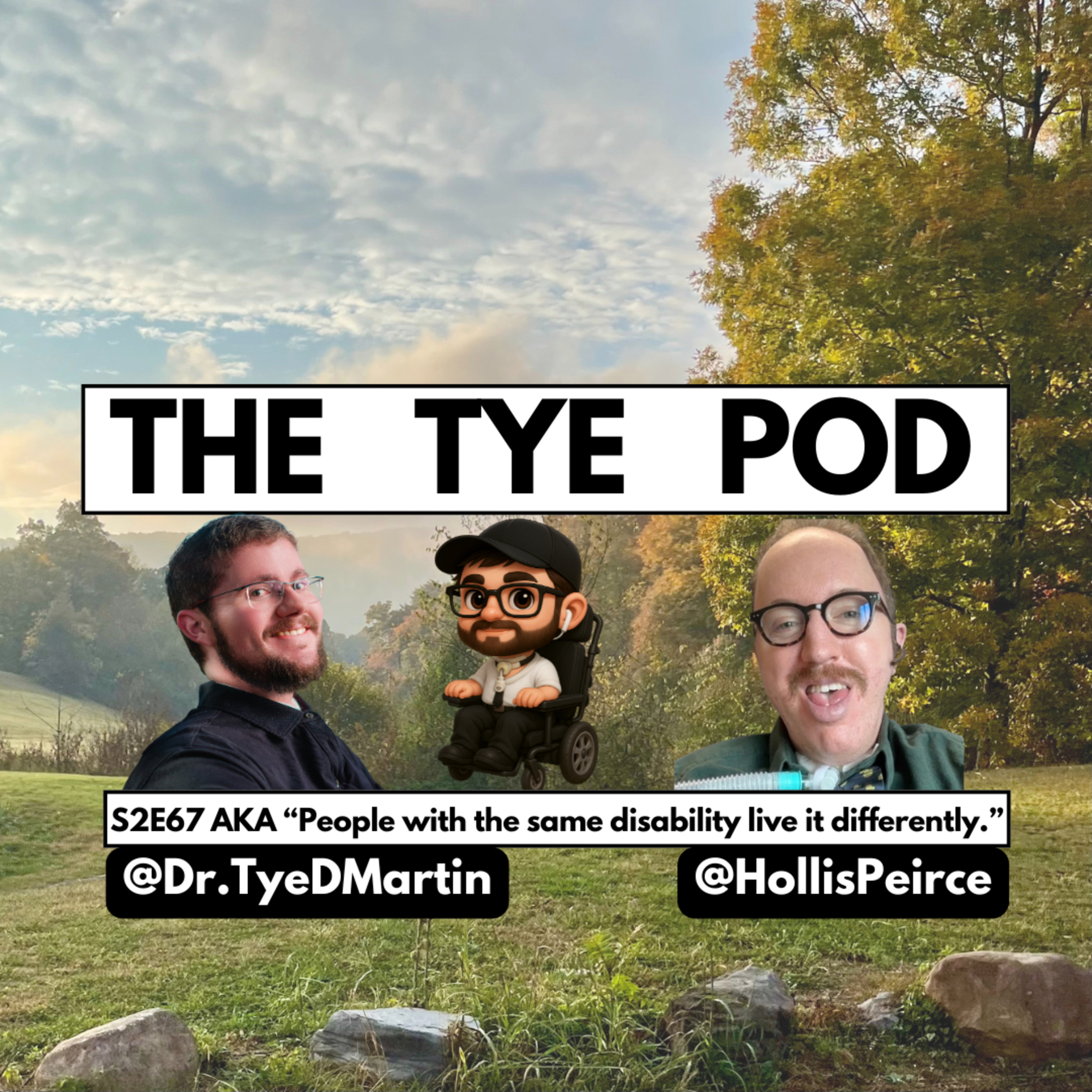 The podcast cover features a scenic outdoor landscape with a grassy field, scattered rocks, and tall autumn trees beneath a softly clouded sky. Centered near the top is a large white banner outlined in black with bold black text reading “THE TYE POD.” Below the banner are three figures: on the left, a smiling man with glasses, a beard, and short brown hair wearing a dark collared shirt; in the middle, a cartoon-style avatar of a person with glasses, a beard, and a black cap seated in a power wheelchair; and on the right, a smiling man with glasses, a mustache, and a light beard wearing a green shirt. Near the bottom, a white text box reads “S2E67 AKA ‘People with the same disability live it differently.’” Two black rounded tags beneath it display social media handles.
