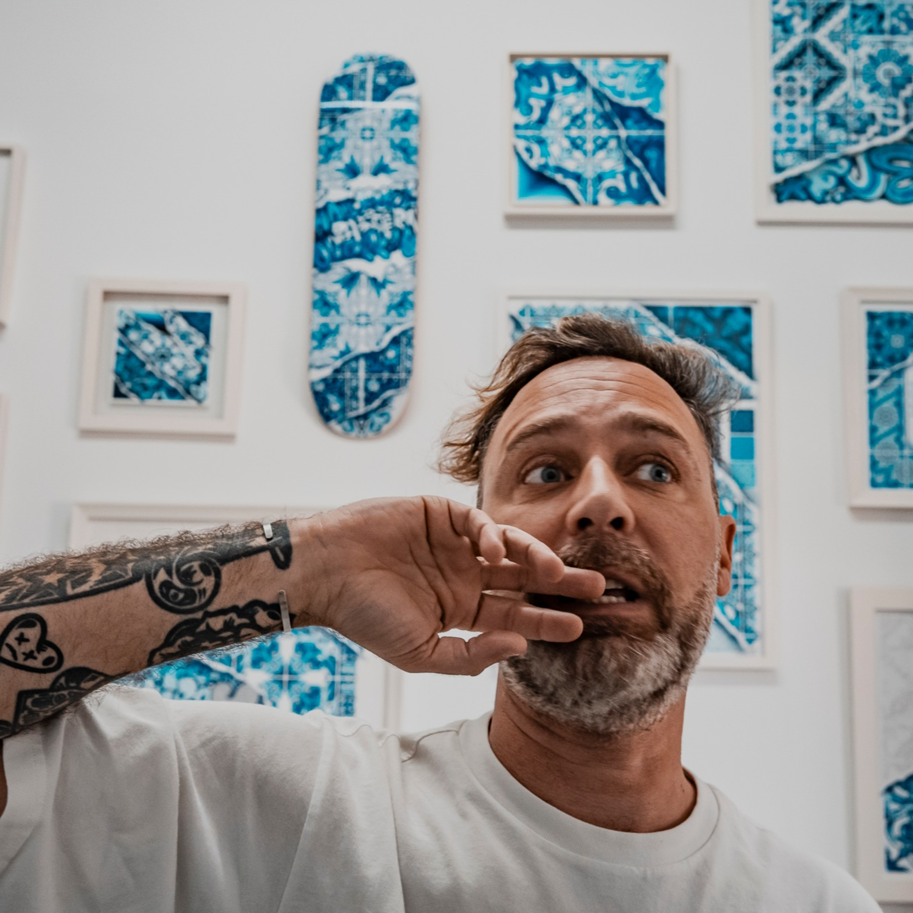 We talk about everything: from the cereal box contest that kickstarted his passion for drawing, to the roots of his now-signature blue tile style, to the challenges (and joys) of running a full-scale art studio with 14 projects on the go.
