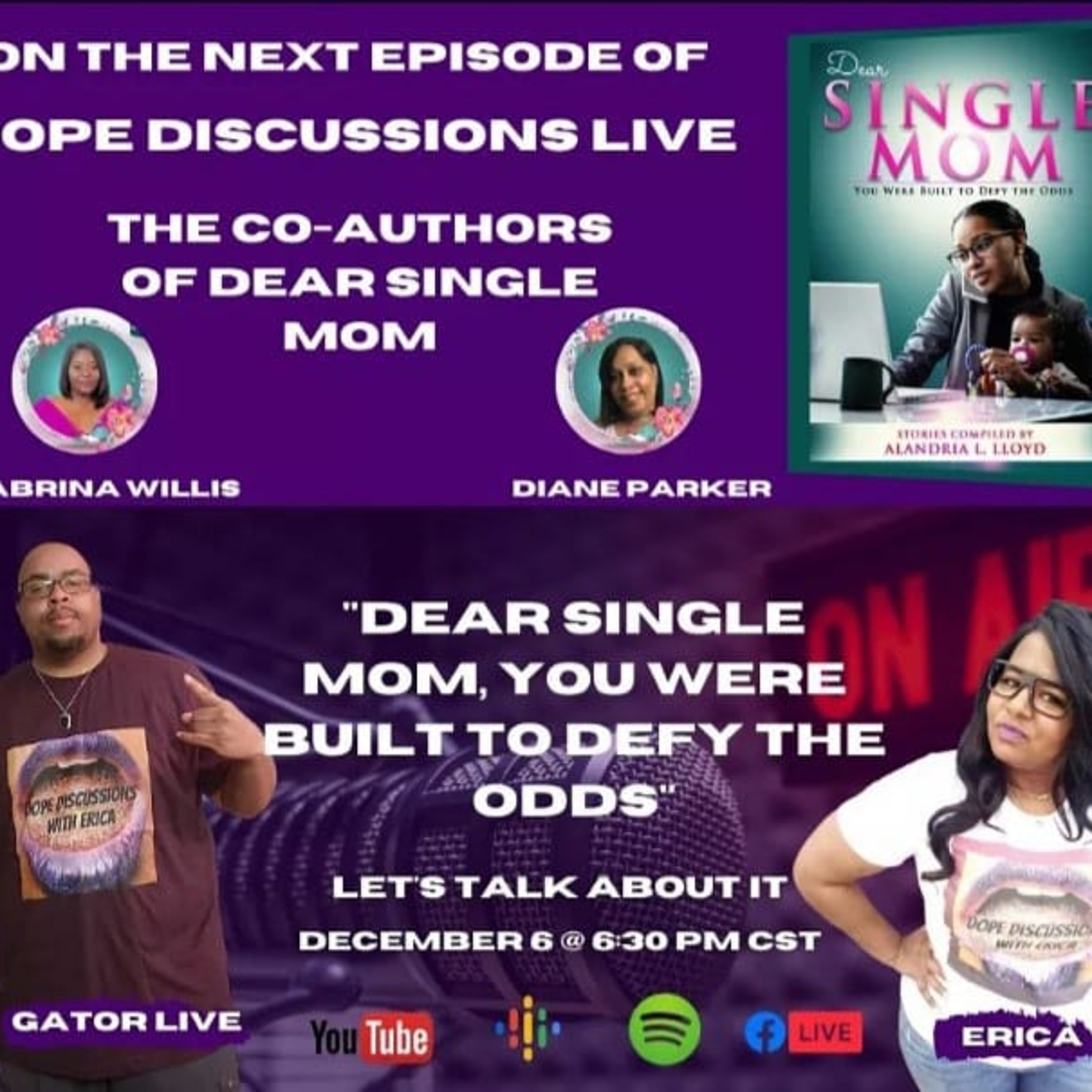 In this episode of Dope Discussions we're talking with two beautiful and inspiring ladies from the upcoming book project called Dear Single Mom!!! Diane Parker from Hammond, Louisiana and Sabrina Willis from St Augustine, Florida will be joining us to talk about their story of defying the odds of single motherhood. They want single moms to know that you can be a boss chic and a good mother at the same time!