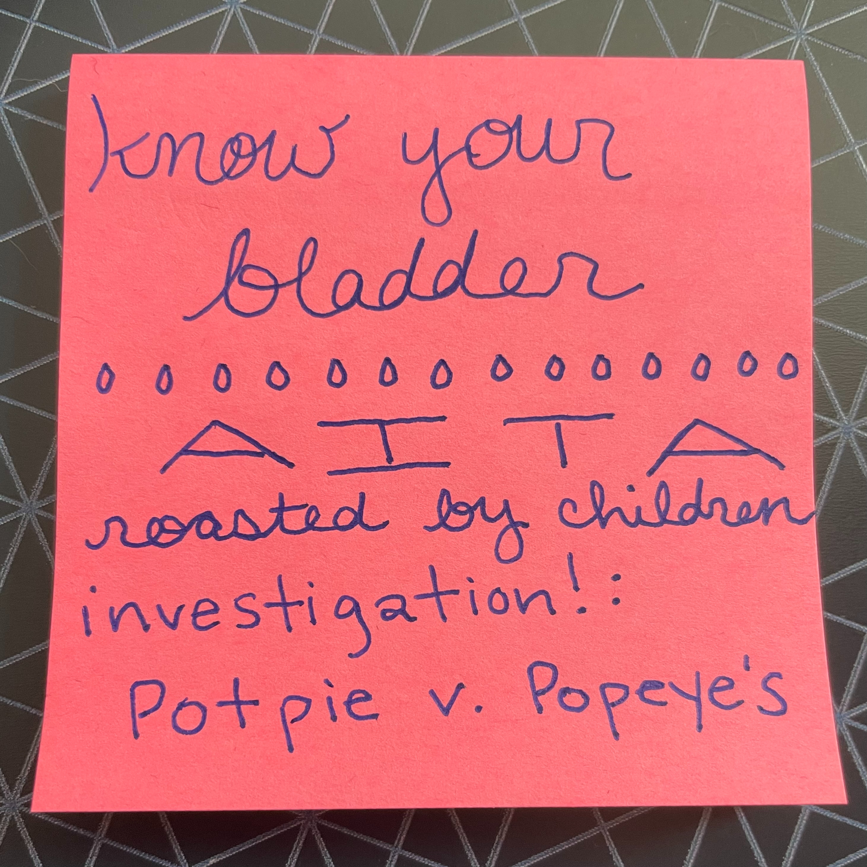 This week, Kate and Christina play AITA, get roasted by children, and conduct a thorough side-by-side comparison of Potpie vs. Popeye's.