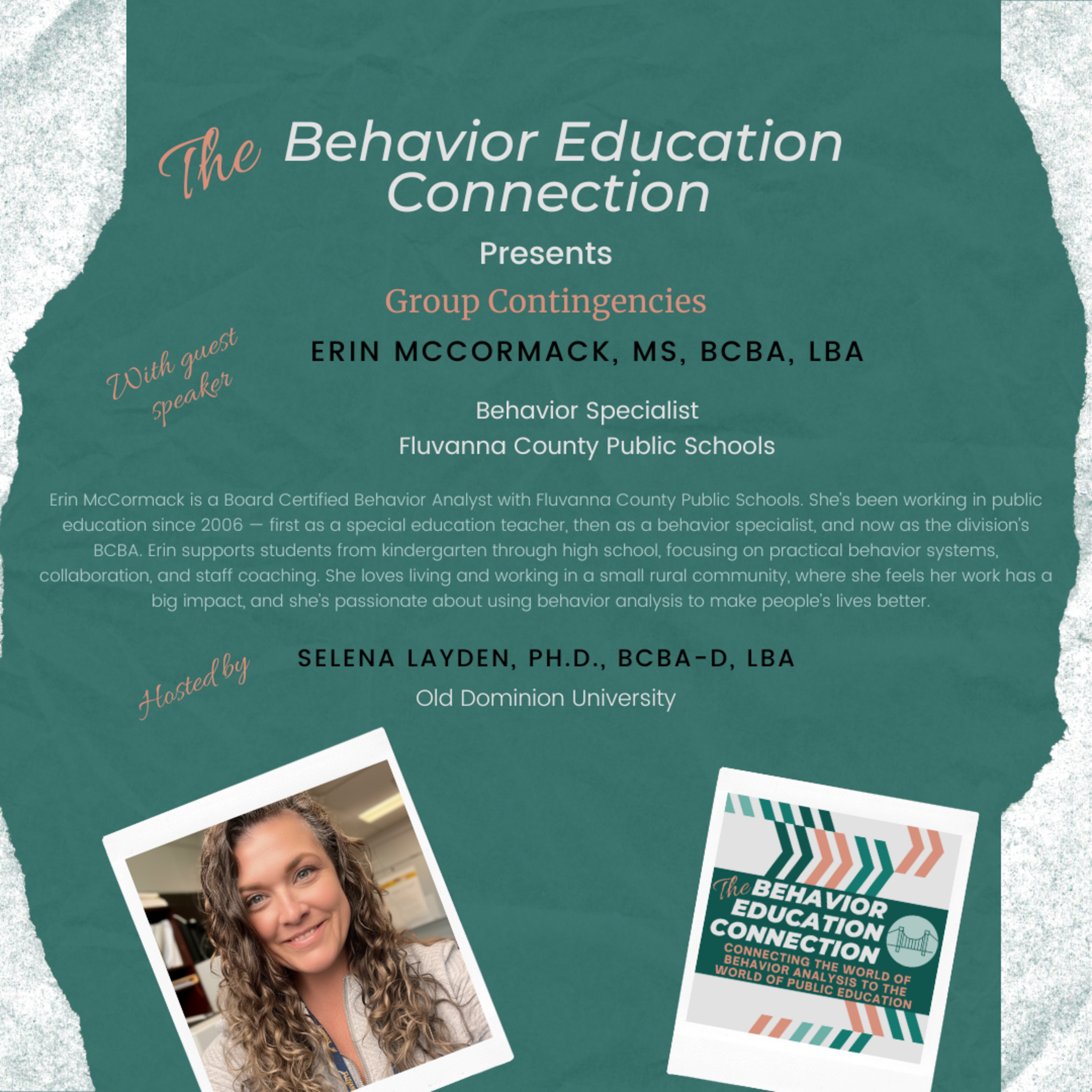 Host: Selena J. Layden, Ph.D., BCBA-D, LBA is an Associate Professor in the Department of Human Movement Studies and Special Education at Old Dominion University. Dr. Layden earned her doctorate degree from the College of William & Mary in Education Policy, Planning, and Leadership with an emphasis in Special Education Administration and her master’s degree in Applied Behavior Analysis from St. Cloud State University in Minnesota. Prior to joining the faculty at ODU, Dr. Layden worked in multiple school divisions focusing on challenging behavior and children with autism spectrum disorder. She was also the Assistant Director of Training at the Autism Center for Excellence at Virginia Commonwealth University. Dr. Layden’s research interests focus on providing effective professional development for school personnel, improving the implementation of evidence-based practices in schools, particularly for students with autism spectrum disorder, and school-based behavior analysts.