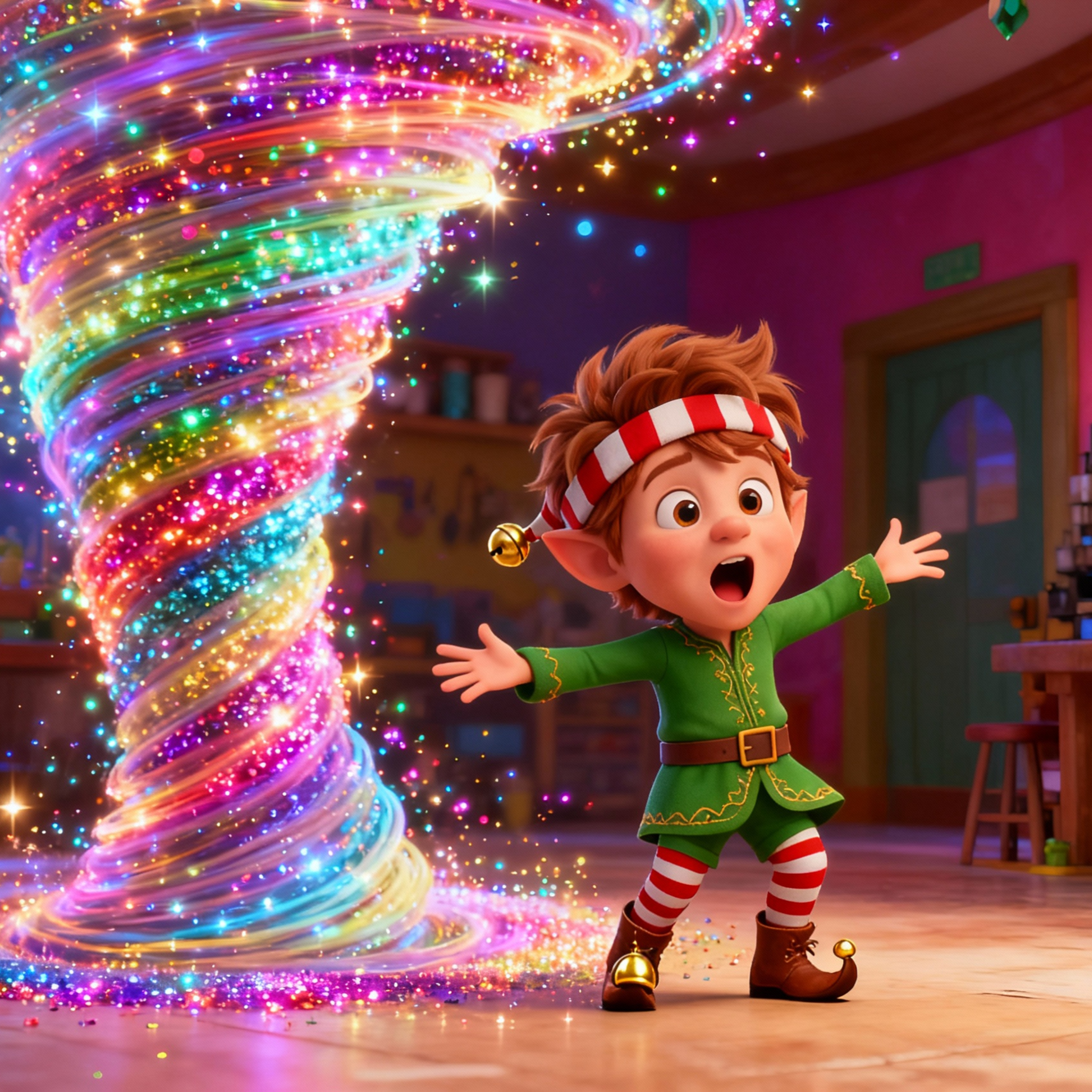 In der Werkstatt verursacht Pip aus Versehen einen riesigen Glitzerwirbelsturm, der alles durcheinanderbringt. Nichts hilft, bis Pip eine geniale Idee hat: Er beruhigt den Sturm mit herbeigezauberten Vanillekipferln. Am Ende glitzert der ganze Nordpol und sogar der Weihnachtsmann findet es köstlich.