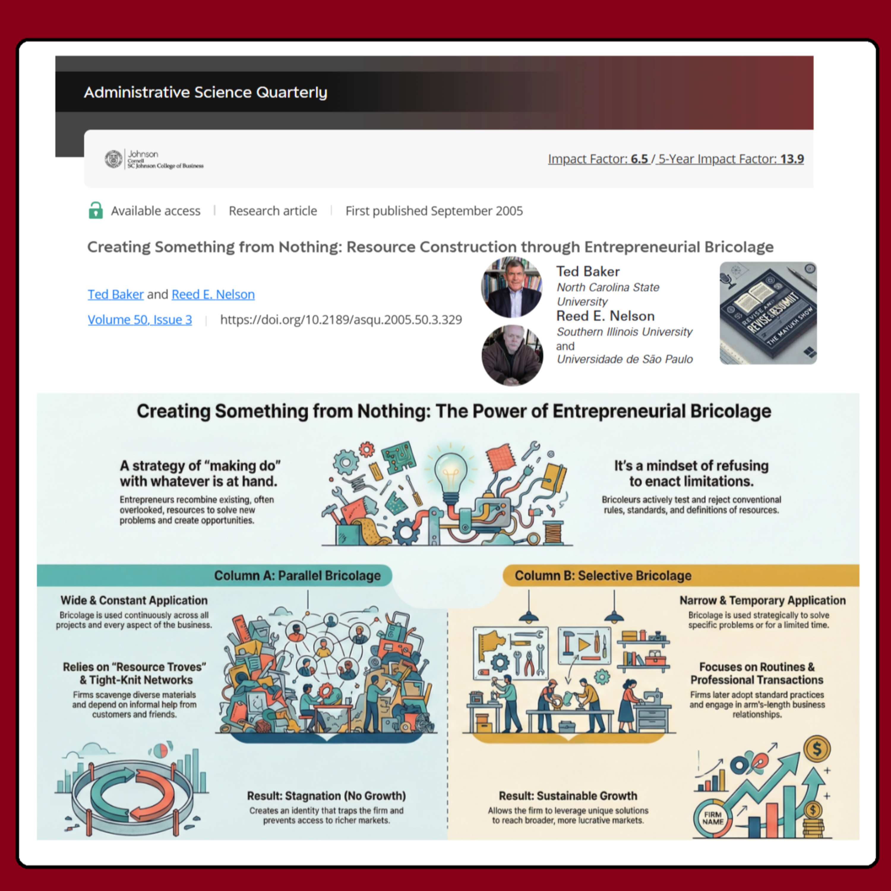 Today’s classic is titled “Creating Something from Nothing: Resource Construction through Entrepreneurial Bricolage” by Ted Baker and Reed E. Nelson, published in Administrative Science Quarterly, a top-tier FT50 journal from the Johnson Graduate School at Cornell and SAGE Publications, way back in September 2005, Volume 50, Issue 3.
