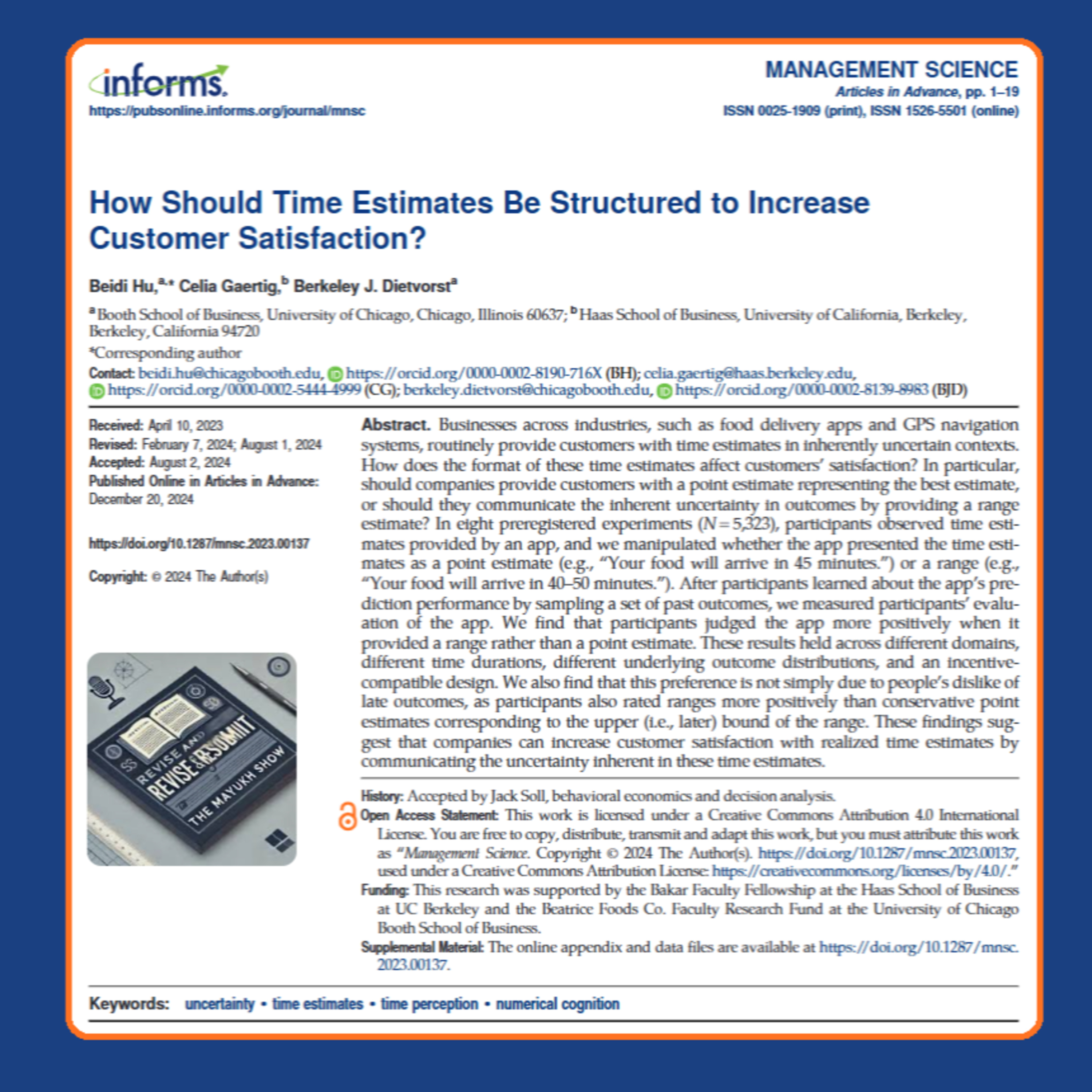 Hu, B., Gaertig, C., & Dietvorst, B. J. (2024). How Should Time Estimates Be Structured to Increase Customer Satisfaction? Management Science. https://doi.org/10.1287/mnsc.2023.00137