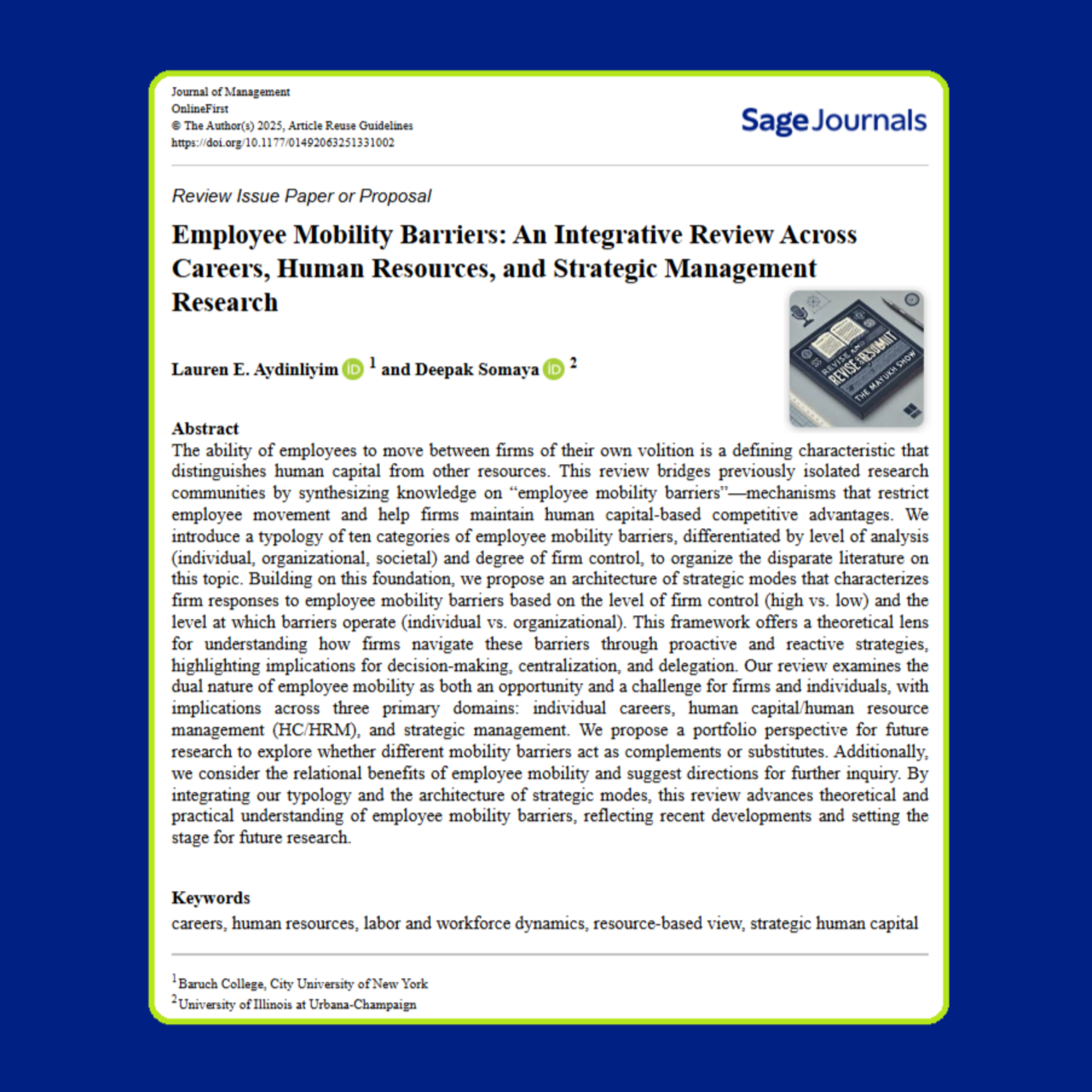 Aydinliyim, L. E., & Somaya, D. (2025). Employee Mobility Barriers: An Integrative Review Across Careers, Human Resources, and Strategic Management Research. Journal of Management, ahead-of-print. https://doi.org/10.1177/01492063251331002