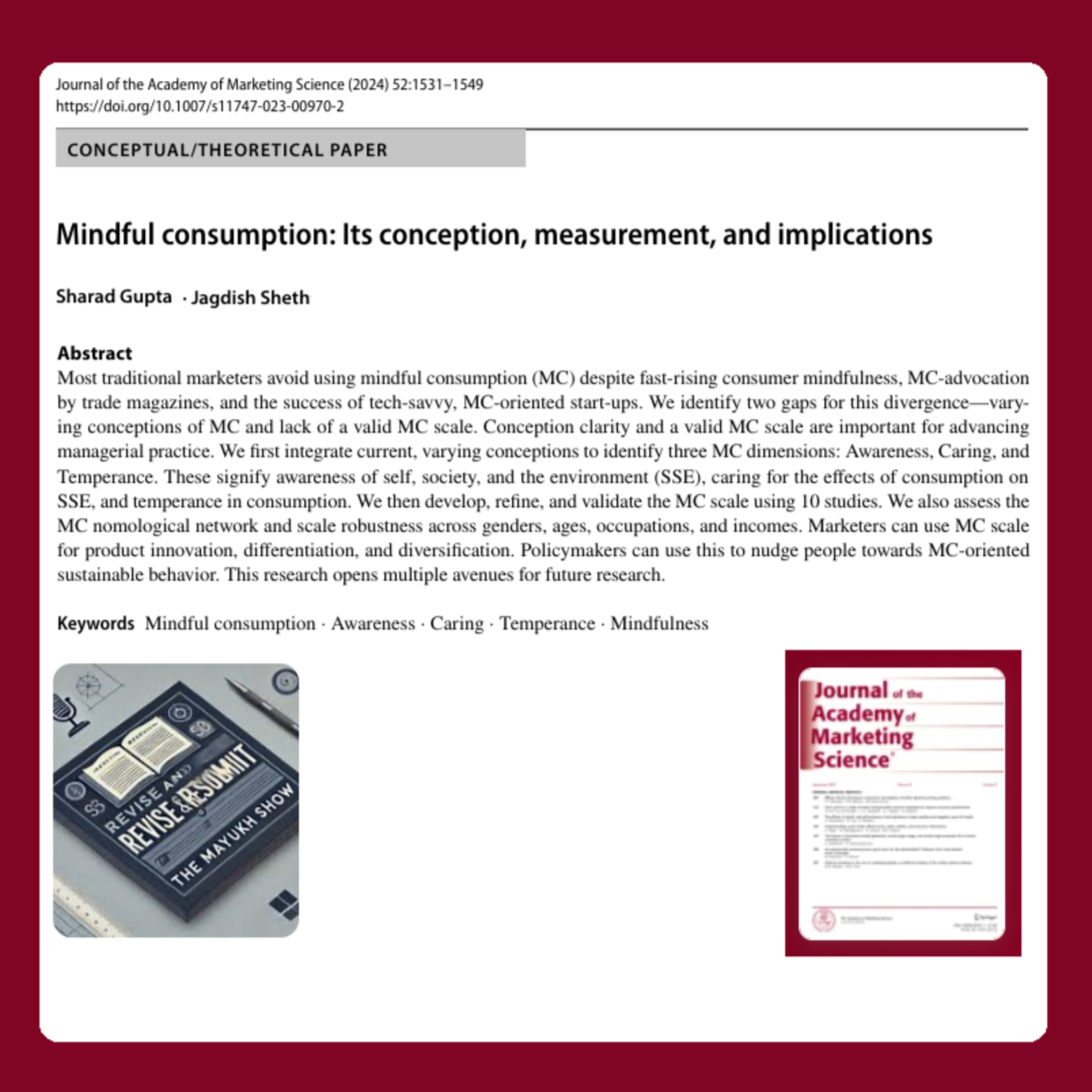Welcome to Revise and Resubmit, the podcast where research takes center stage, ideas evolve, and theories find new meaning. Today, we dive into an intriguing topic in the world of marketing: mindful consumption. In this episode, we explore the newly published paper, "Mindful Consumption: Its Conception, Measurement, and Implications," co-authored by Sharad Gupta from Cardiff School of Management and Jagdish Sheth, a renowned marketing scholar from Emory University’s Goizueta Business School. Their work appears in the prestigious Journal of the Academy of Marketing Science, a member of the elite FT50 journal list—meaning it belongs to the Financial Times' top 50 business journals in the world.