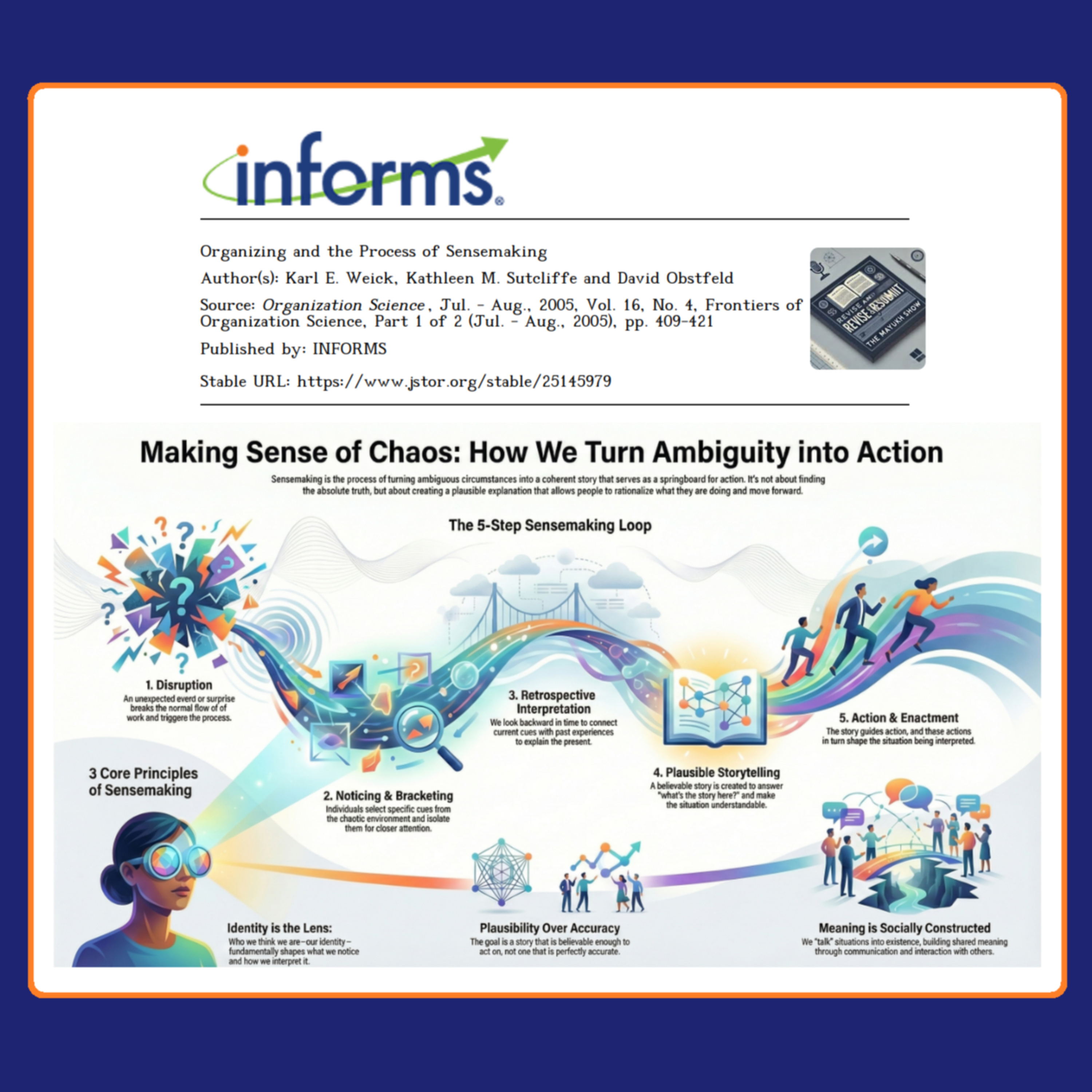 We’re diving into “Organizing and the Process of Sensemaking” by Karl E. Weick, Kathleen M. Sutcliffe, and David Obstfeld, published in Organization Science, a prestigious FT50 journal, and brought to the world by INFORMS back on August 1, 2005. 🏛️📚