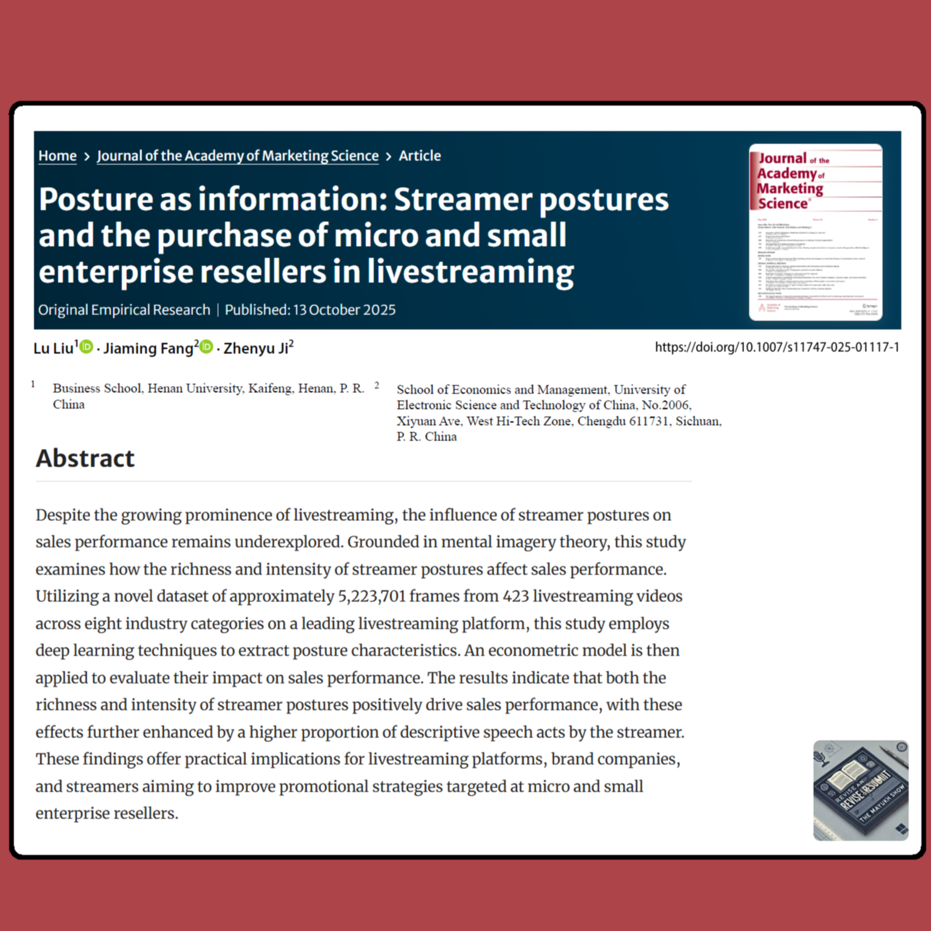 Our spotlight article is titled “Posture as Information: Streamer Postures and the Purchase of Micro and Small Enterprise Resellers in Livestreaming” — authored by Lu Liu, Jiaming Fang, and Zhenyu Ji, and published on October 13, 2025, by Springer Nature. 🌍📘