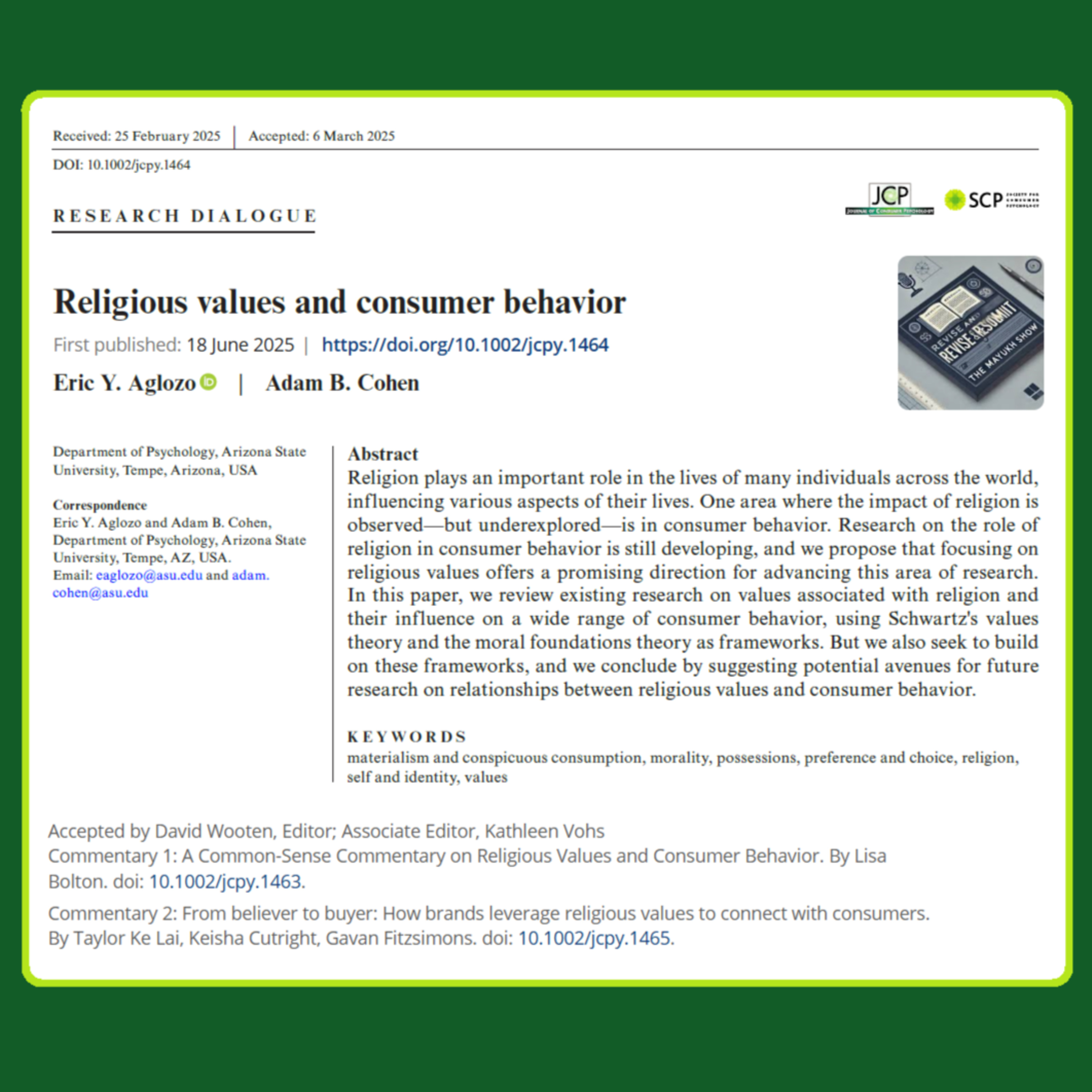 "Religious values and consumer behavior", authored by Eric Y. Aglozo and Adam B. Cohen, published on June 18, 2025, in the FT50-listed Journal of Consumer Psychology, brought to you by Wiley on behalf of the Society for Consumer Psychology. 🧠🛍️