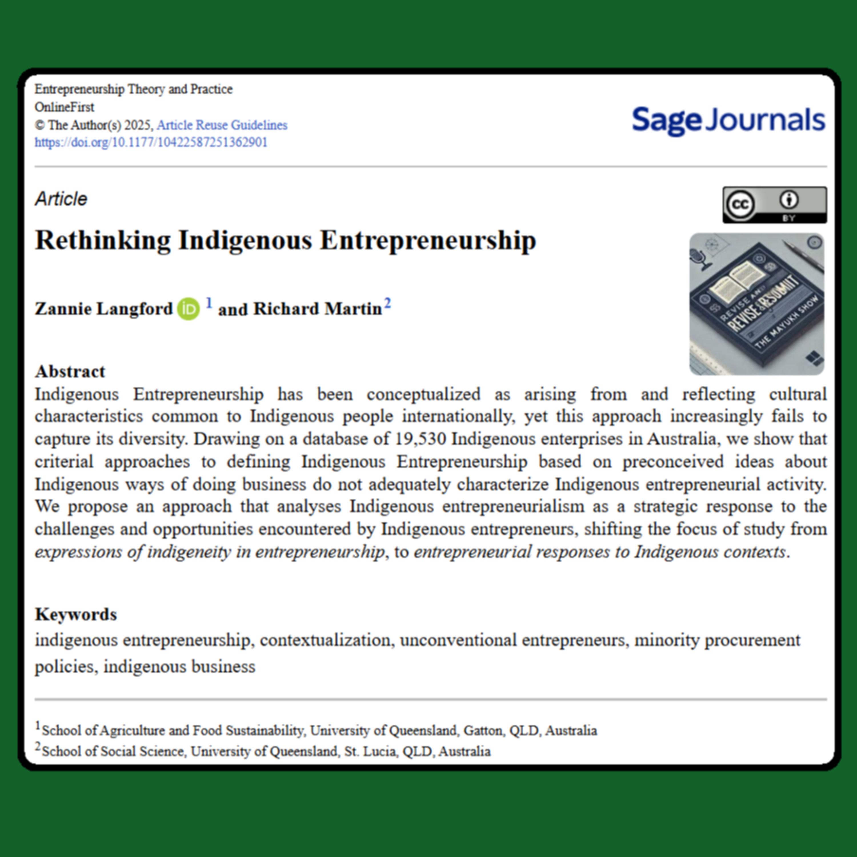 Langford, Z., & Martin, R. (2025). Rethinking Indigenous Entrepreneurship. Entrepreneurship Theory and Practice, 0(0). https://doi.org/10.1177/10422587251362901