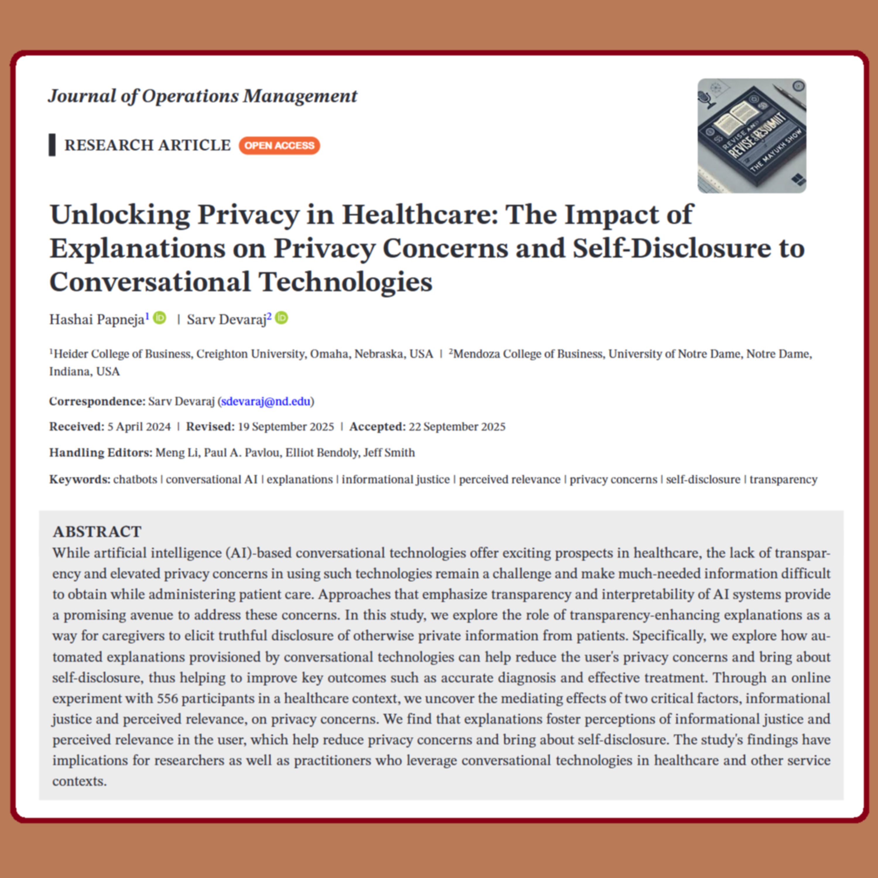 Papneja, H., and S. Devaraj. 2025. “ Unlocking Privacy in Healthcare: The Impact of Explanations on Privacy Concerns and Self-Disclosure to Conversational Technologies.” Journal of Operations Management 1–36. https://doi.org/10.1002/joom.70026