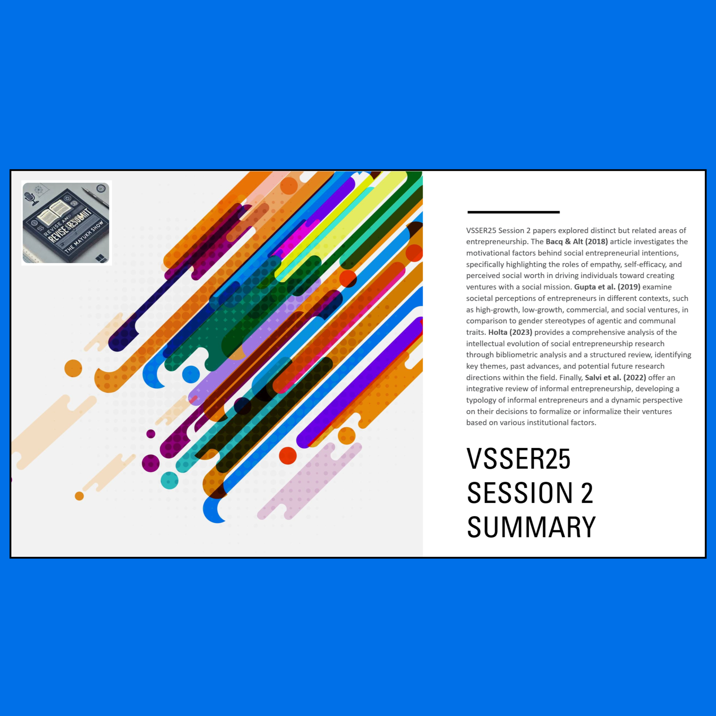 The 4 papers from #VSSER25 Session 2 explored distinct but related areas of entrepreneurship. The Bacq & Alt (2018) article investigates the motivational factors behind social entrepreneurial intentions, specifically highlighting the roles of empathy, self-efficacy, and perceived social worth in driving individuals toward creating ventures with a social mission. Gupta et al. (2019) examine societal perceptions of entrepreneurs in different contexts, such as high-growth, low-growth, commercial, and social ventures, in comparison to gender stereotypes of agentic and communal traits. Holta (2023) provides a comprehensive analysis of the intellectual evolution of social entrepreneurship research through bibliometric analysis and a structured review, identifying key themes, past advances, and potential future research directions within the field. Finally, Salvi et al. (2022) offer an integrative review of informal entrepreneurship, developing a typology of informal entrepreneurs and a dynamic perspective on their decisions to formalize or informalize their ventures based on various institutional factors.