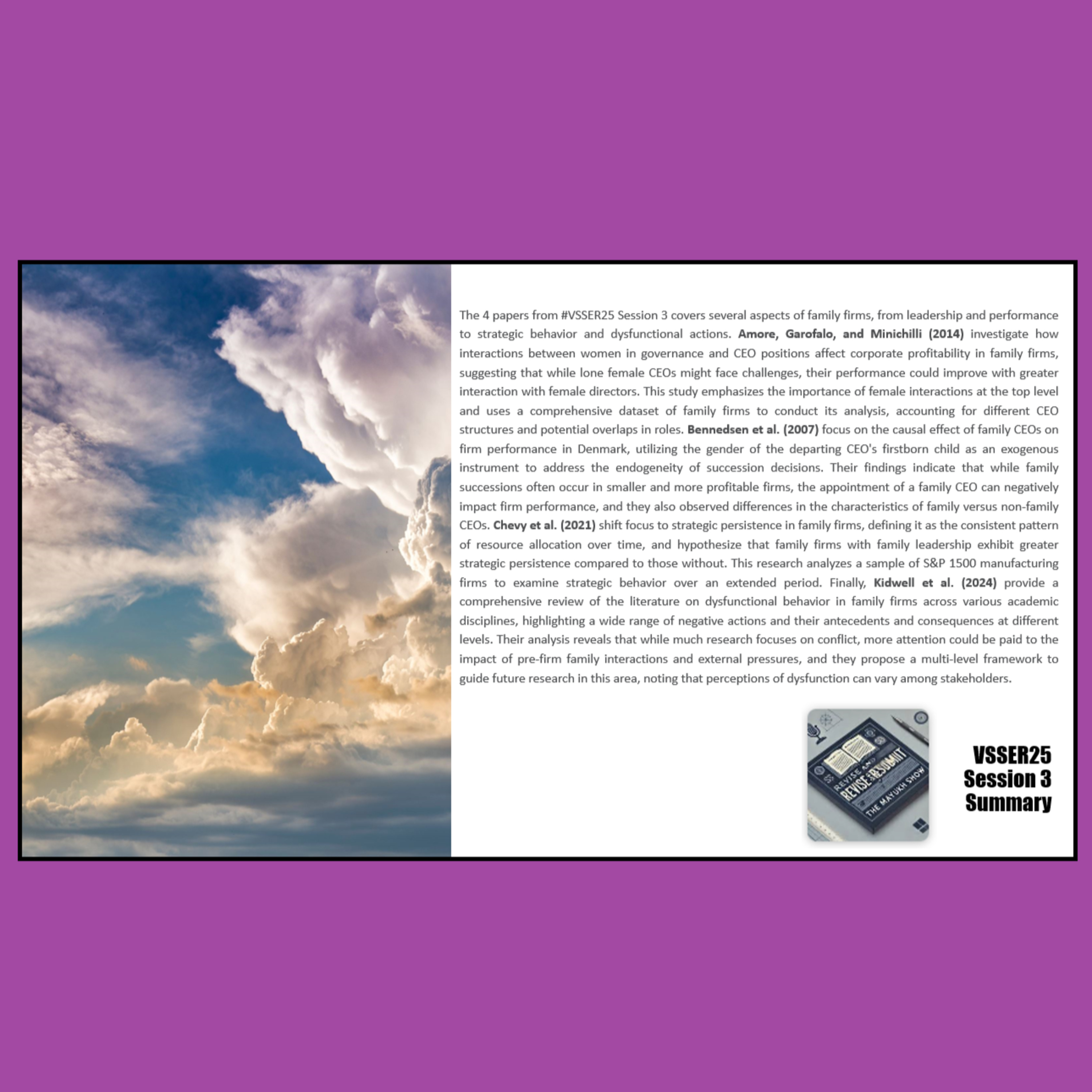 The 4 papers from #VSSER25 Session 3 covers several aspects of family firms, from leadership and performance to strategic behavior and dysfunctional actions. Amore, Garofalo, and Minichilli (2014) investigate how interactions between women in governance and CEO positions affect corporate profitability in family firms, suggesting that while lone female CEOs might face challenges, their performance could improve with greater interaction with female directors. This study emphasizes the importance of female interactions at the top level and uses a comprehensive dataset of family firms to conduct its analysis, accounting for different CEO structures and potential overlaps in roles. Bennedsen et al. (2007) focus on the causal effect of family CEOs on firm performance in Denmark, utilizing the gender of the departing CEO's firstborn child as an exogenous instrument to address the endogeneity of succession decisions. Their findings indicate that while family successions often occur in smaller and more profitable firms, the appointment of a family CEO can negatively impact firm performance, and they also observed differences in the characteristics of family versus non-family CEOs. Chevy et al. (2021) shift focus to strategic persistence in family firms, defining it as the consistent pattern of resource allocation over time, and hypothesize that family firms with family leadership exhibit greater strategic persistence compared to those without. This research analyzes a sample of S&P 1500 manufacturing firms to examine strategic behavior over an extended period. Finally, Kidwell et al. (2024) provide a comprehensive review of the literature on dysfunctional behavior in family firms across various academic disciplines, highlighting a wide range of negative actions and their antecedents and consequences at different levels. Their analysis reveals that while much research focuses on conflict, more attention could be paid to the impact of pre-firm family interactions and external pressures, and they propose a multi-level framework to guide future research in this area, noting that perceptions of dysfunction can vary among stakeholders.
