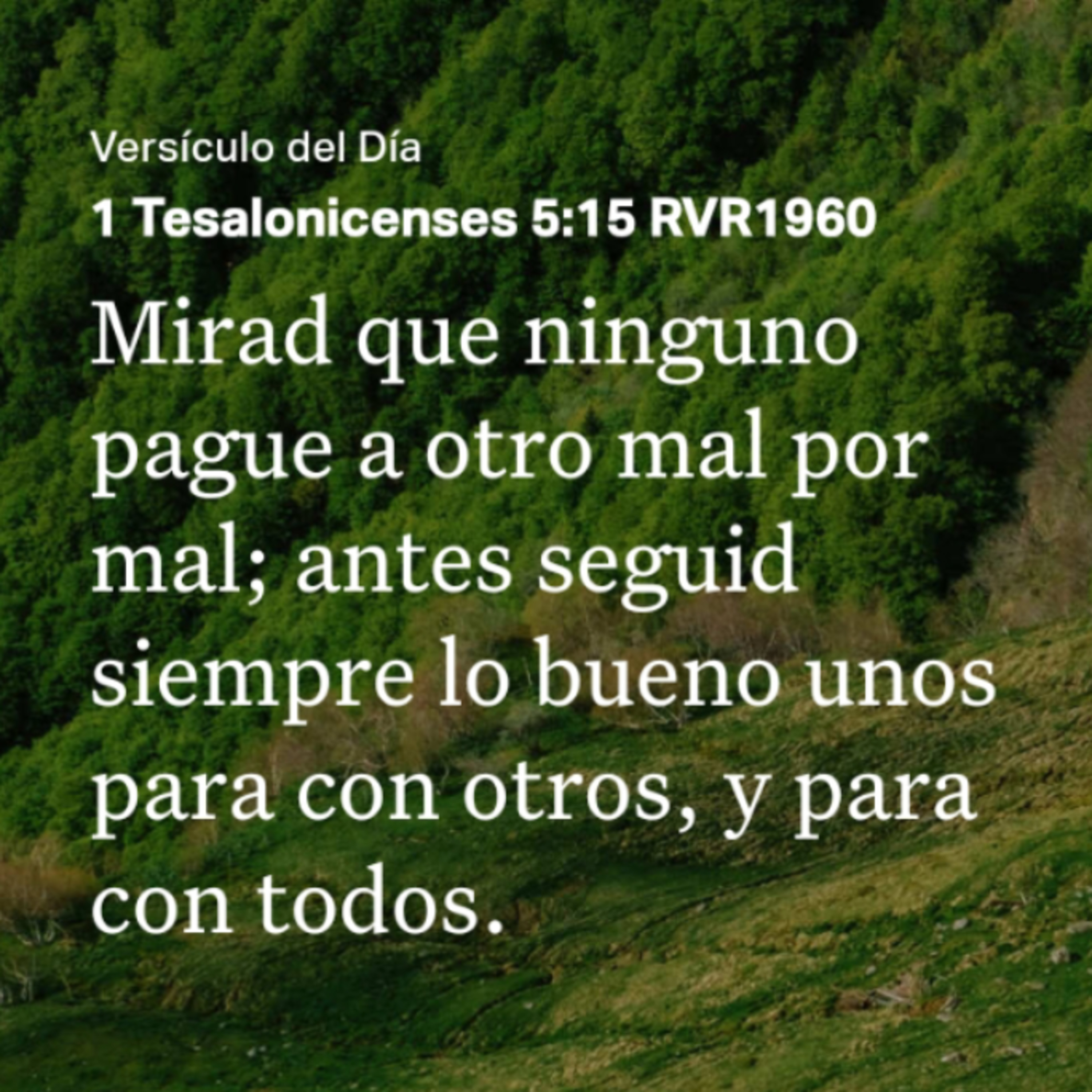 [12] Os rogamos, hermanos, que reconozcáis a los que trabajan entre vosotros, y os presiden en el Señor, y os amonestan; [13] y que los tengáis en mucha estima y amor por causa de su obra. Tened paz entre vosotros. [14] También os rogamos, hermanos, que amonestéis a los ociosos, que alentéis a los de poco ánimo, que sostengáis a los débiles, que seáis pacientes para con todos. [15] Mirad que ninguno pague a otro mal por mal; antes seguid siempre lo bueno unos para con otros, y para con todos. [16] Estad siempre gozosos. [17] Orad sin cesar. [18] Dad gracias en todo, porque esta es la voluntad de Dios para con vosotros en Cristo Jesús. [19] No apaguéis al Espíritu. [20] No menospreciéis las profecías. [21] Examinadlo todo; retened lo bueno. [22] Absteneos de toda especie de mal. [23] Y el mismo Dios de paz os santifique por completo; y todo vuestro ser, espíritu, alma y cuerpo, sea guardado irreprensible para la venida de nuestro Señor Jesucristo. [24] Fiel es el que os llama, el cual también lo hará.