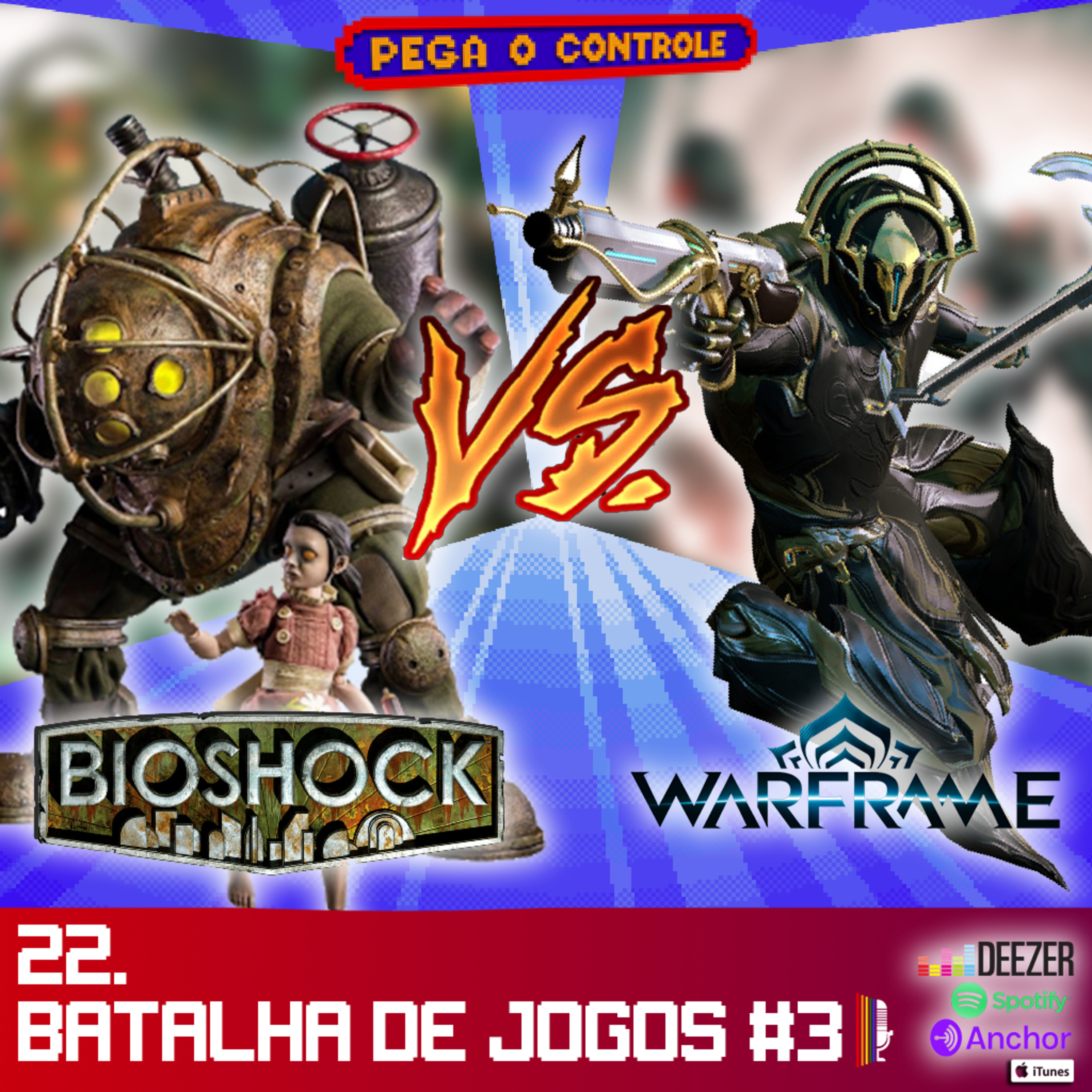Sejam bem vindos a mais um episódio do nosso podcast Pega o Controle. Nesse episódio, nós voltamos com o BATALHA DE JOGOS e dessa vez trouxemos dois games de tiro que se passam em mundos diferentes. O primeiro é BIOSHOCK (que se passa debaixo da água) e o segundo é WARFRAME (que se passa em outro planeta). Nesse episódio nossos hosts Cris e Dorian batalham freneticamente para defender seus games escolhidos. Não perca essa batalha até a morte (ou não né), esperamos que você goste e não esqueça de nos seguir nas nossas redes sociais, plataformas de streaming e no nosso mais novo canal no Youtube.