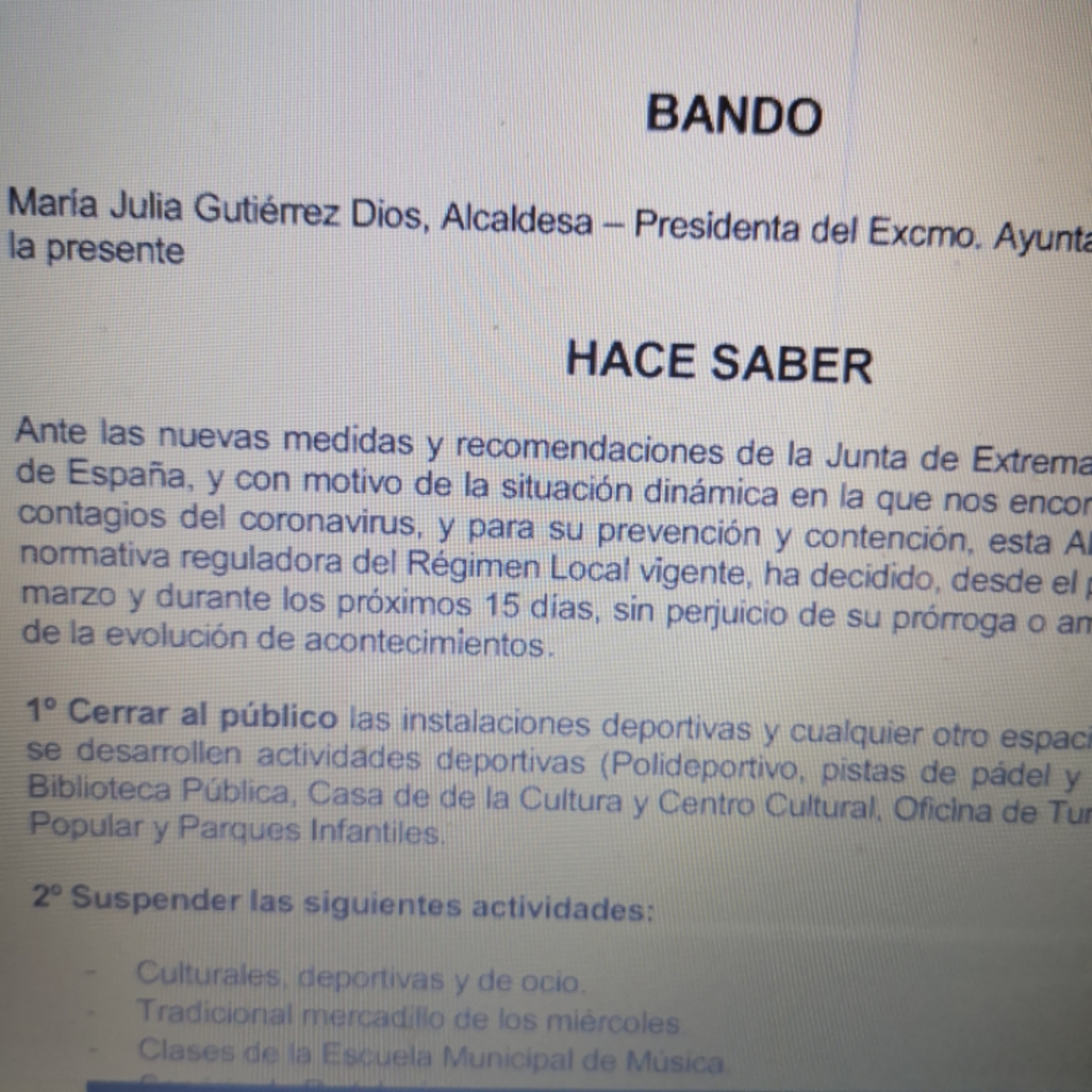 Bando del Ayuntamiento en relación al Coronavirus