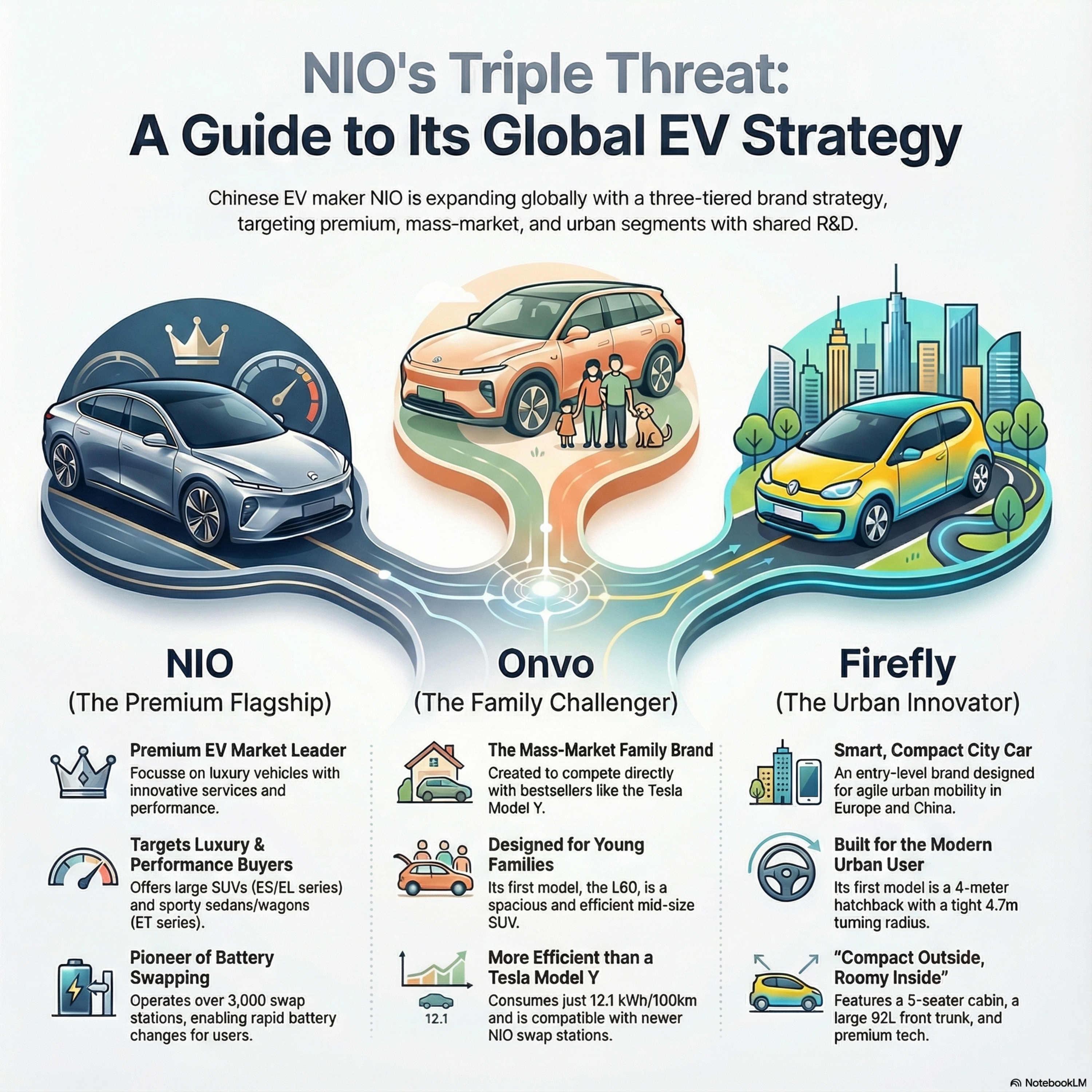 The provided source details the rapid growth of NIO, a prominent Chinese manufacturer of high-end electric vehicles renowned for its battery-swapping technology and advanced artificial intelligence. Having achieved significant sales milestones by the end of 2025, the company is solidifying its dominance in the luxury EV market while expanding its footprint across Europe. Beyond its premium sedans and SUVs, the organization is launching two sub-brands, Onvo and Firefly, to offer more affordable and compact options for a wider range of consumers. This strategic diversification is supported by a massive infrastructure of swap stations and a move toward hybrid models to navigate international market demands. Ultimately, the sources highlight NIO's evolution from a regional startup into a global automotive powerhouse with plans to enter several new European territories by 2026.