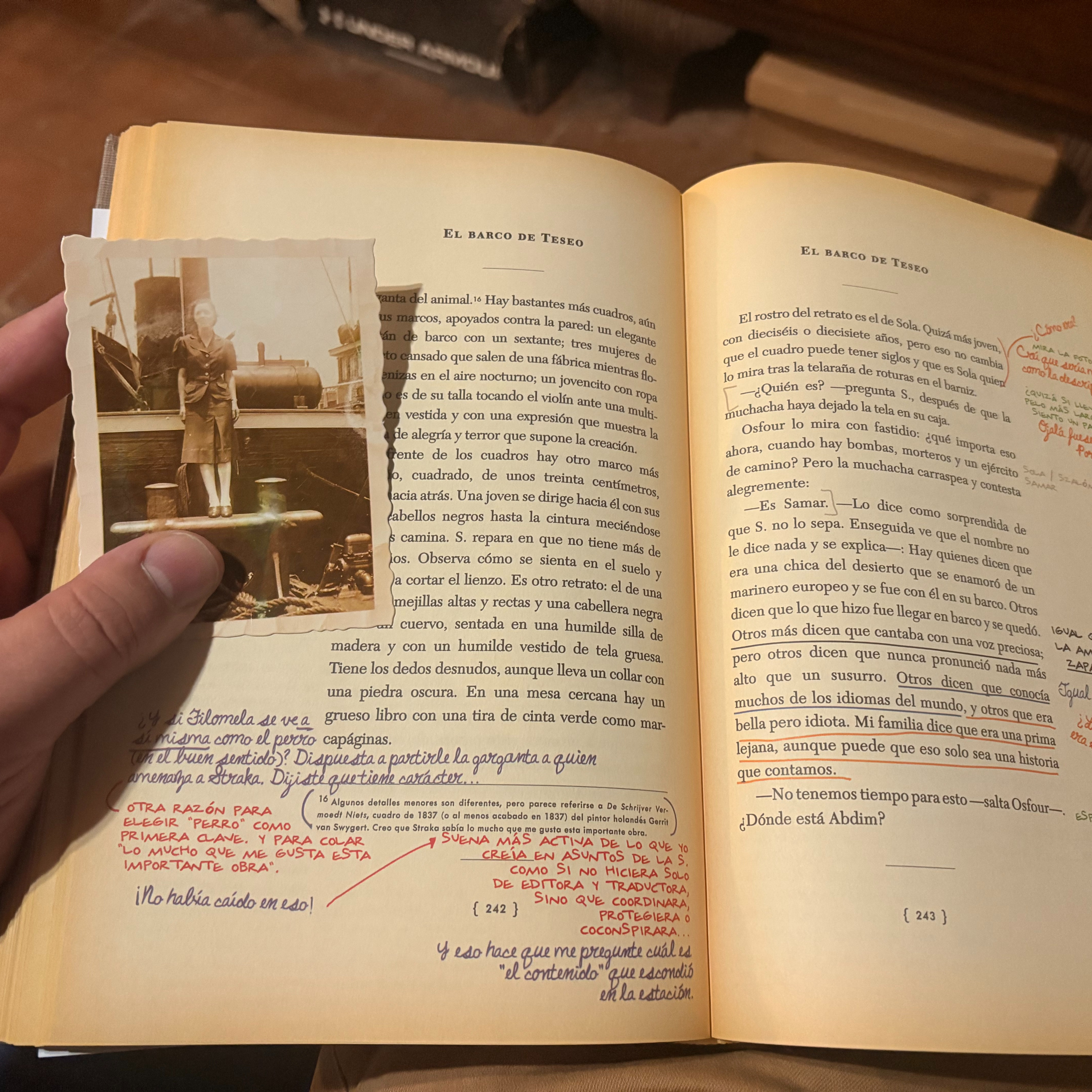 Cuando abrís El barco de Teseo no es solo una novela, sino un museo portátil. Un museo de papel, de tinta y de huellas humanas. Está la historia principal —una ficción firmada por un tal V. M. Straka, un escritor misterioso— pero lo que realmente te arrastra son las notas escritas en los márgenes por dos lectores desconocidos, que intentan descifrar quién fue ese autor y qué quiso decir.
