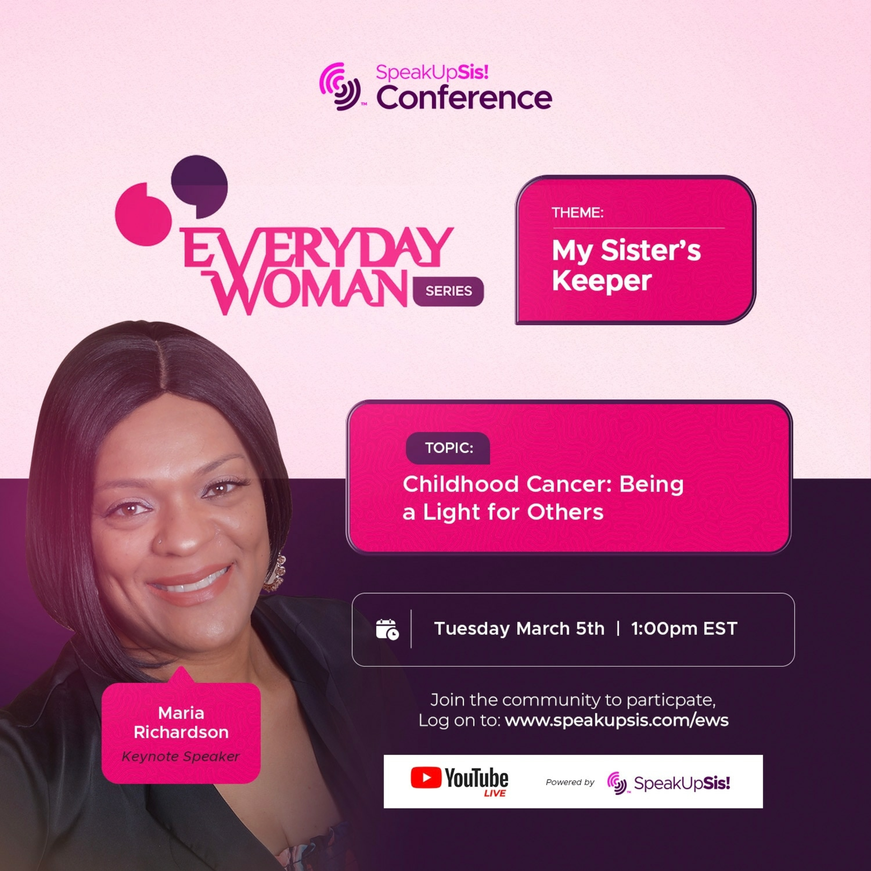 The Everyday Woman Series™ (EWS) is a virtual SpeakUpSis® Conference that provides an opportunity for everyday women to share how they positively impact the world every day. They share their testimonies to help other women overcome the hard stuff of life. This year's EWS theme is "My Sister's Keeper."