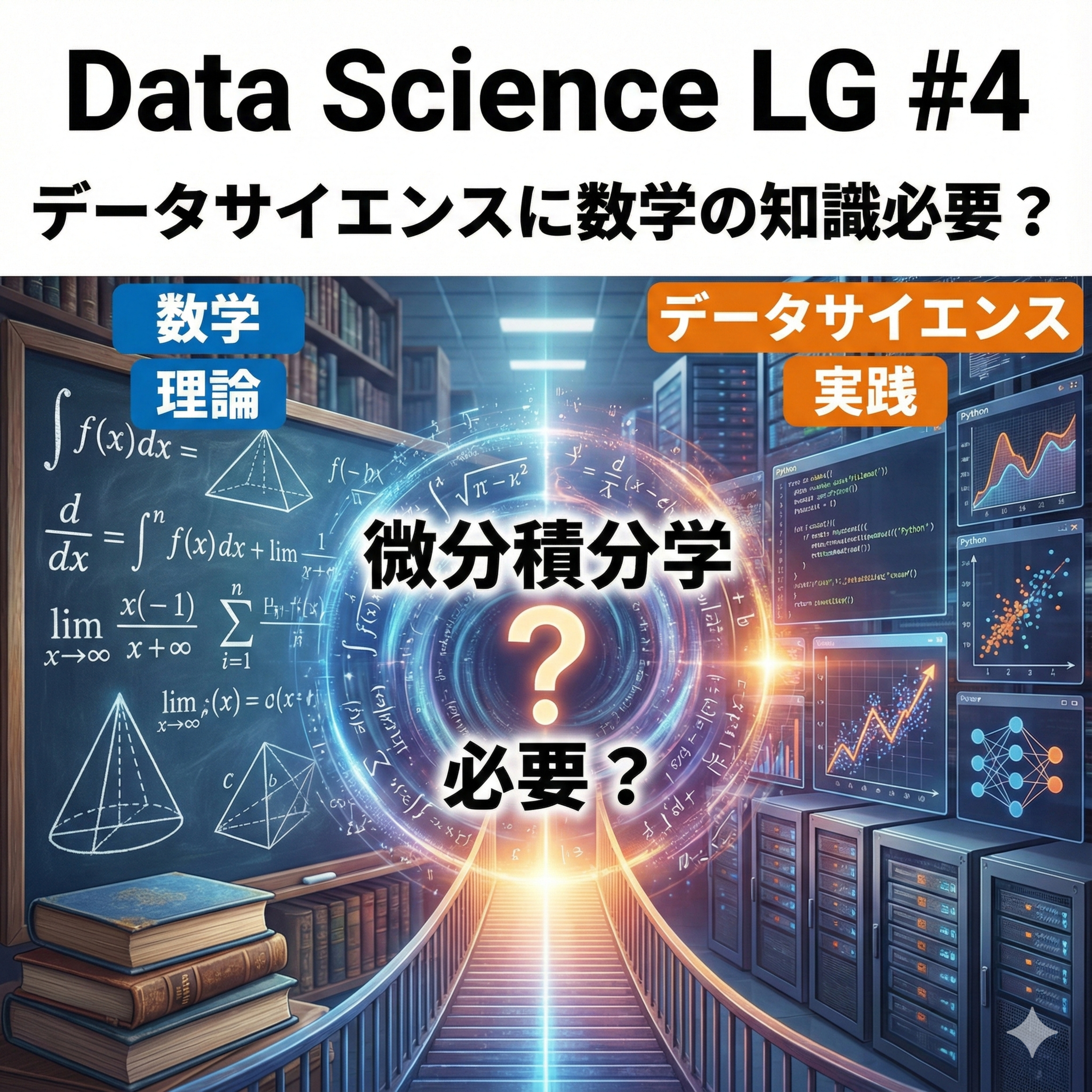 データサイエンスを学ぶ学生が直面する最初の壁の一つである「数学」に焦点を当て、特に微分積分学の学習について議論しました。理系・文系の「学生」それぞれが、どのような点で苦労し、どのような教材が役立ったか、具体的な事例を交えて共有しました。線形代数学についても触れつつ、次回以降、より深く掘り下げていく予定です。