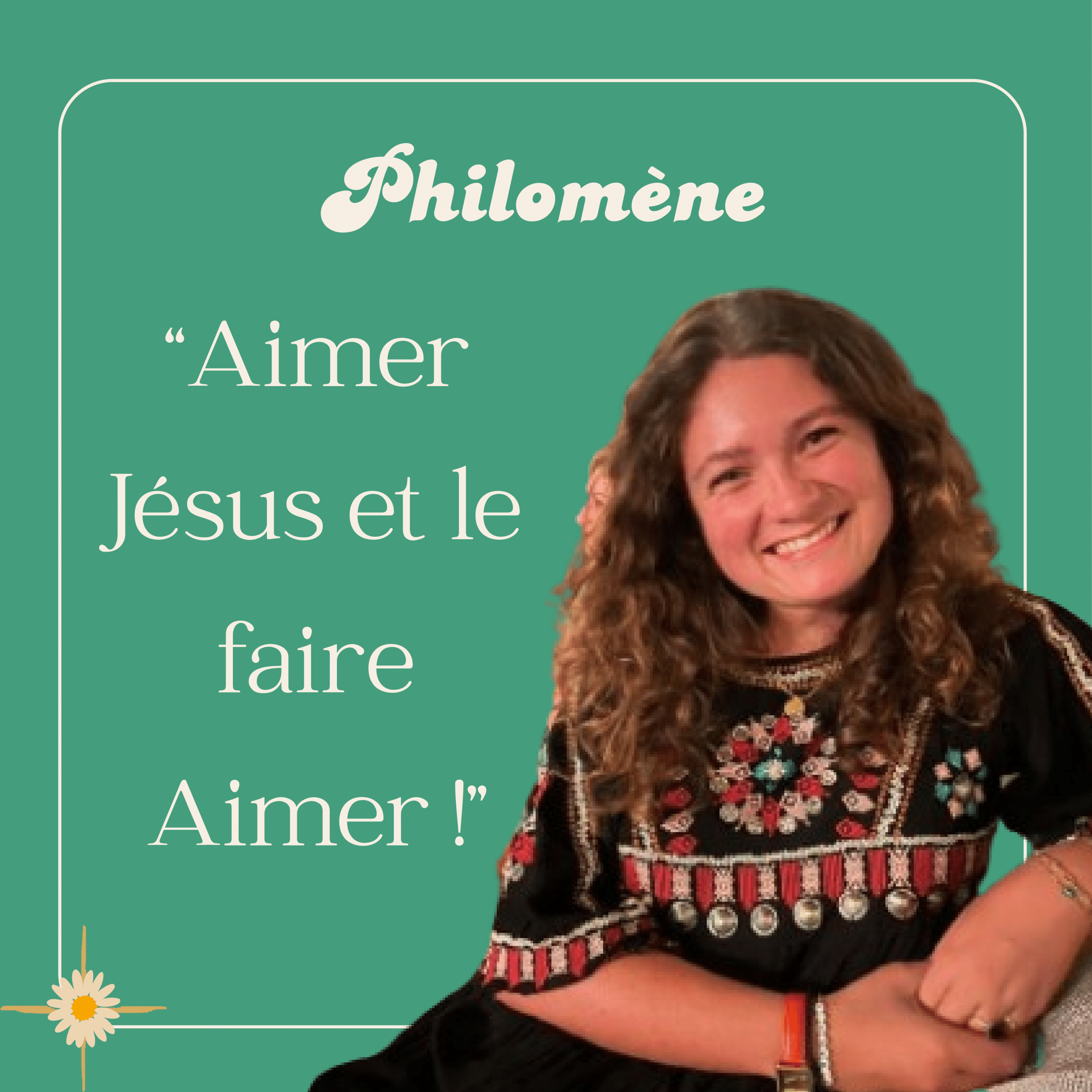 Philomène, c'est une vraie musicienne ! Sa passion depuis toute petite : le clavecin ! Mais une autre a pris une place essentielle : celle de l'Amour du Christ ! Car malgré l'épreuve du divorce de ses parents, Philomène s'est d'abord rapprochée de Dieu chez les évangéliques, pour finalement "retourner à la maison" dans la foi catholique. Son amour pour Marie, les belles églises et ses bons copains pleins de foi, n'y sont pas pour rien. Aujourd'hui, elle laisse Dieu composer la plus belle des partitions pour sa vie, en faisant retentir cette jolie mélodie d'amour autour d'elle : Aimer Jésus et le faire aimer !"