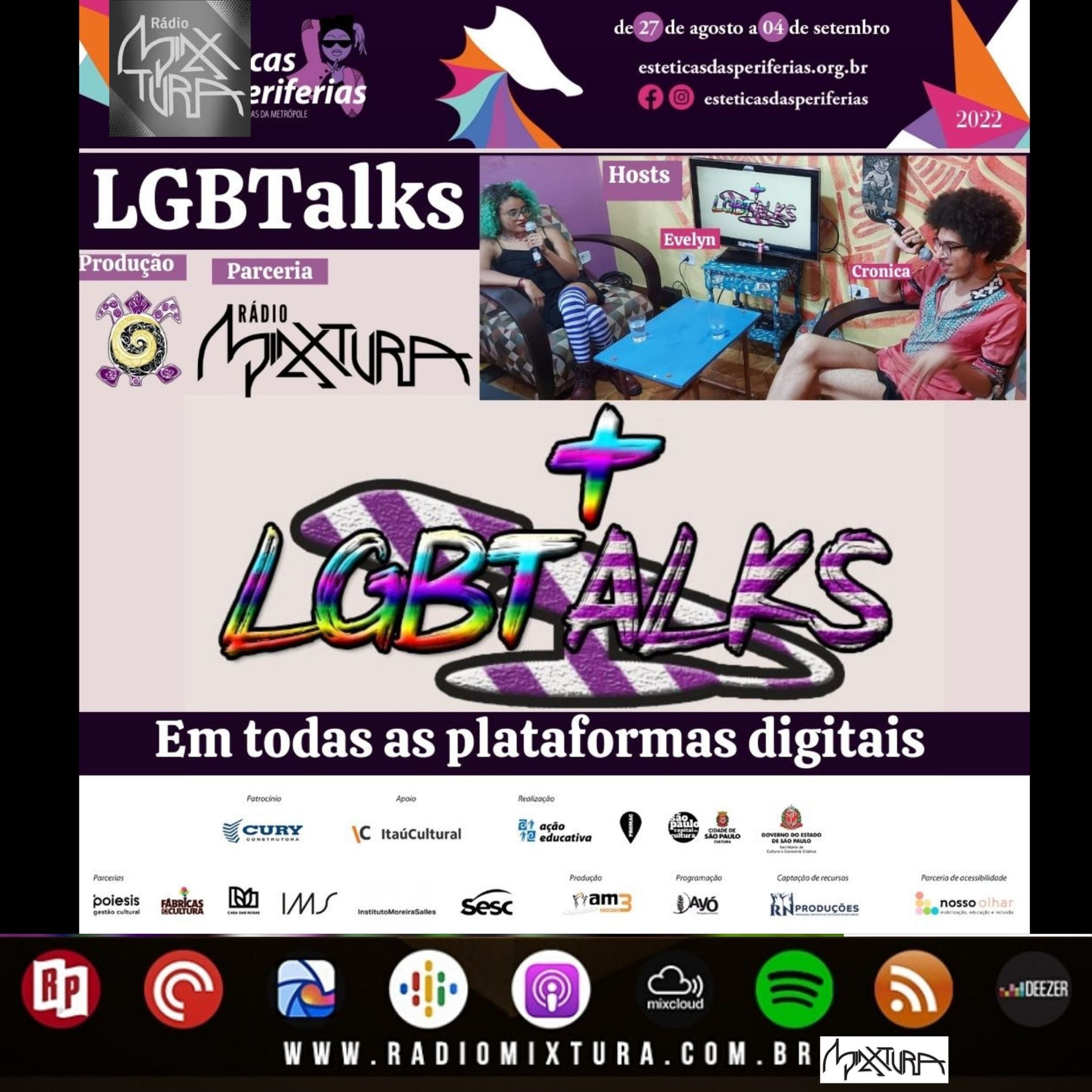 LGBTalks retrata arte e a luta LGBTQIAP+ com seu programa de Podcasts nas redes sociais Programação é desenvolvida pela Denkyem Studios e a transmissão será realizada pelas redes sociais com a parceria da Rádio Mixtura 📻. O LGBTalks é um podcast de diálogos sobre arte e cultura LGBTQIAP+ que compõe a programação da 12ª edição do Estéticas das Periferias promovida pela Ação educativa. O Evento por sua vez é caracterizado por dar voz a produção cultural e artística para diversos coletivos das periferias de São Paulo. O podcast retrata e coloca no centro a cultura marginalizada LGBTQIAP+, enfatizando e apresentando a cultura ballroom. As produções dos podcasts são realizadas no Estúdio da Rádio Mixtura, dentro do espaço compartilhado da Agência Solano Trindade na Rua Batista Crespo, 105 - Campo Limpo, zona sul de São Paulo e com a produtora idealizadora dos podcasts Denkyem Studios. Sobre A Denkyem Studios A Denkyem Studios surgiu em 2021 com o intuito de dar asas aos artistas independentes das periferias de São Paulo. Sua sede se localiza no Jardim São Luiz na Zona Sul. Ela é uma produtora multicultural que realiza trabalhos Audiovisuais, Fotográficos, Desenvolvimento Web, Literatura e de Comunicação. O seu objetivo é contar as histórias dos nossos apresentando o quilombo cultural ocultado das favelas. Para acessar nossas outras redes sociais oficiais 🌳🍃, acessem o Linktr.ee na Bio do nosso perfil do Instagram – @radiomixtura. @esteticasdasperiferias #EstéticasdasPeriferias #CulturaBallroom @acaoeducativa #AçãoEducativa #LGBTQIAP #agsolanotrindade #radiomixtura @podlgbtalks #lgbtalks #DenkyemStudios