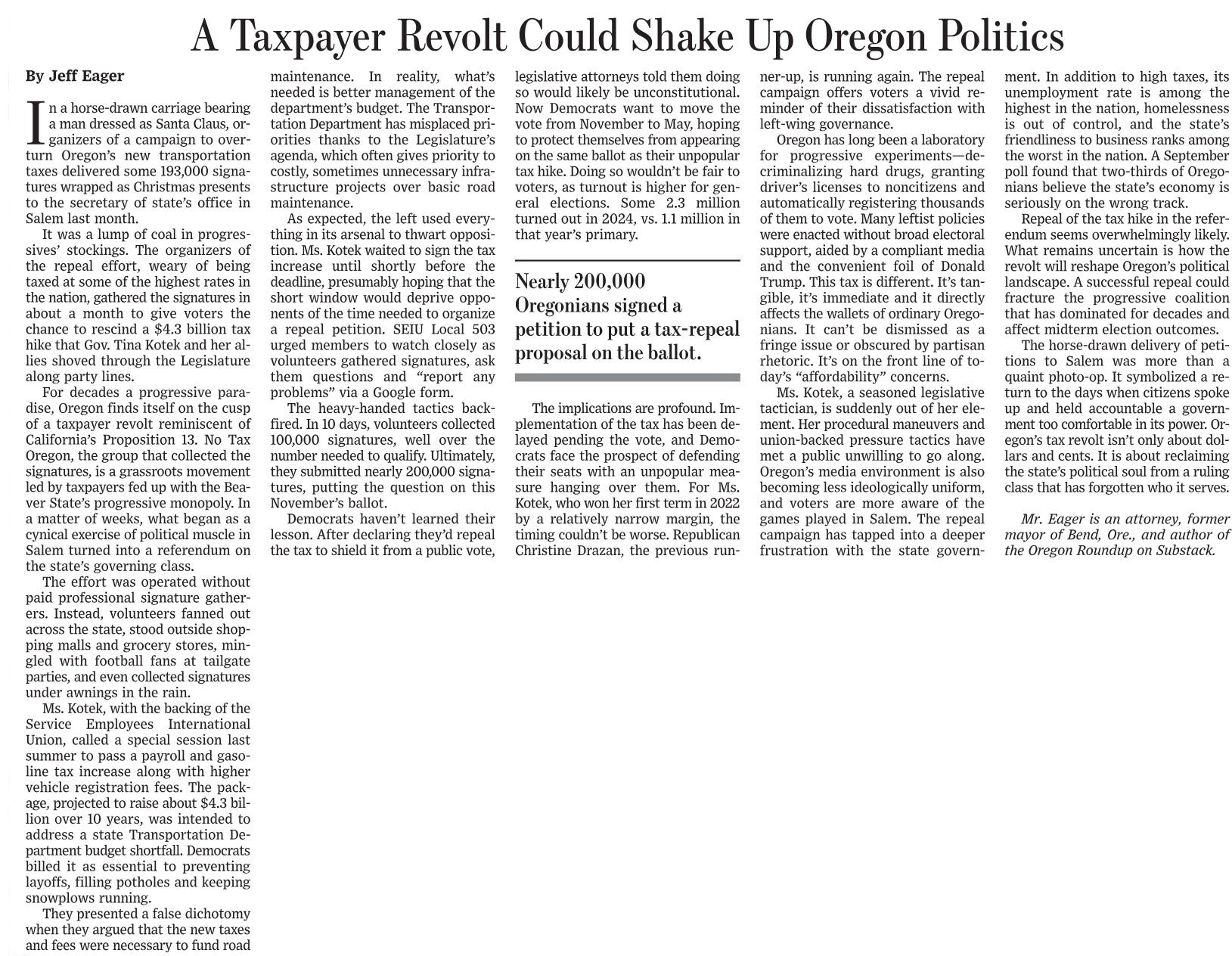 The Wall Street Journal today published an op-ed I wrote about the transportation tax mess Tina Kotek and her allies find themselves in, and what it might mean for Oregon’s ruling progressive coalition.