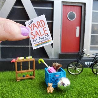 Maggie: So what is a tiny yard sale? What is the point? How would someone even go about setting one up? Like any regular scale yard sale, a tiny yard sale is about getting rid of stuff you don’t need and engaging with your community.