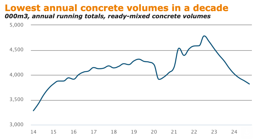 * ready-mixed concrete volumes fell to 3.81m cubic metres in calendar 2024, down 7.7% from the December 2023 year to their lowest level in a decade;