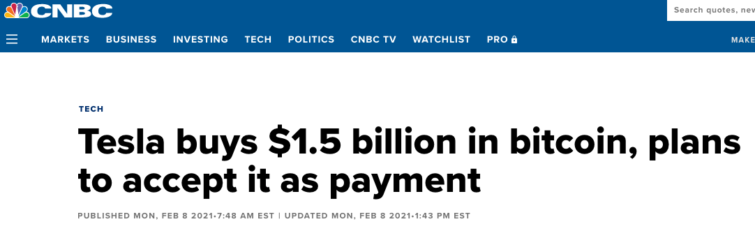 I’m sure many of you saw this, but last week Tesla put $1.5 BILLION dollars worth of Bitcoin on their corporate balance sheet.