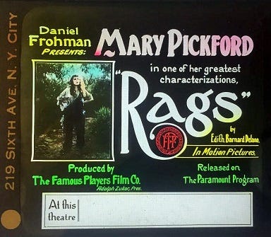 It’s Mary Pickford again, this time as Rags, so-named because she’s so poor she wears ragged clothing. Pickford never disappoints, and she’s as fabulous in this as she has been in any film I’ve seen her in to this point.