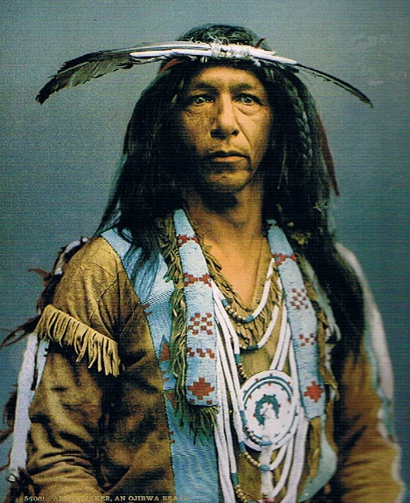 Photochrom image, circa 1900, of an Ojibway tribesman, by William Henry Jackson and the Detroit Photographic Company, from “The Birth of a Century” by Jim Hughes (London & New York: Tauris Parke Books; 1994; ISBN 1-85043-646-0).