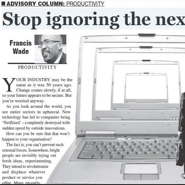 Your industry may be the same as it was 50 years ago. Change comes slowly, if at all, so your future appears to be secure. But you’re worried, anyway. As you look around the world you see entire sectors in upheaval. New technology has led to companies being “Netflixed” - completely destroyed with sudden speed by outside innovations.