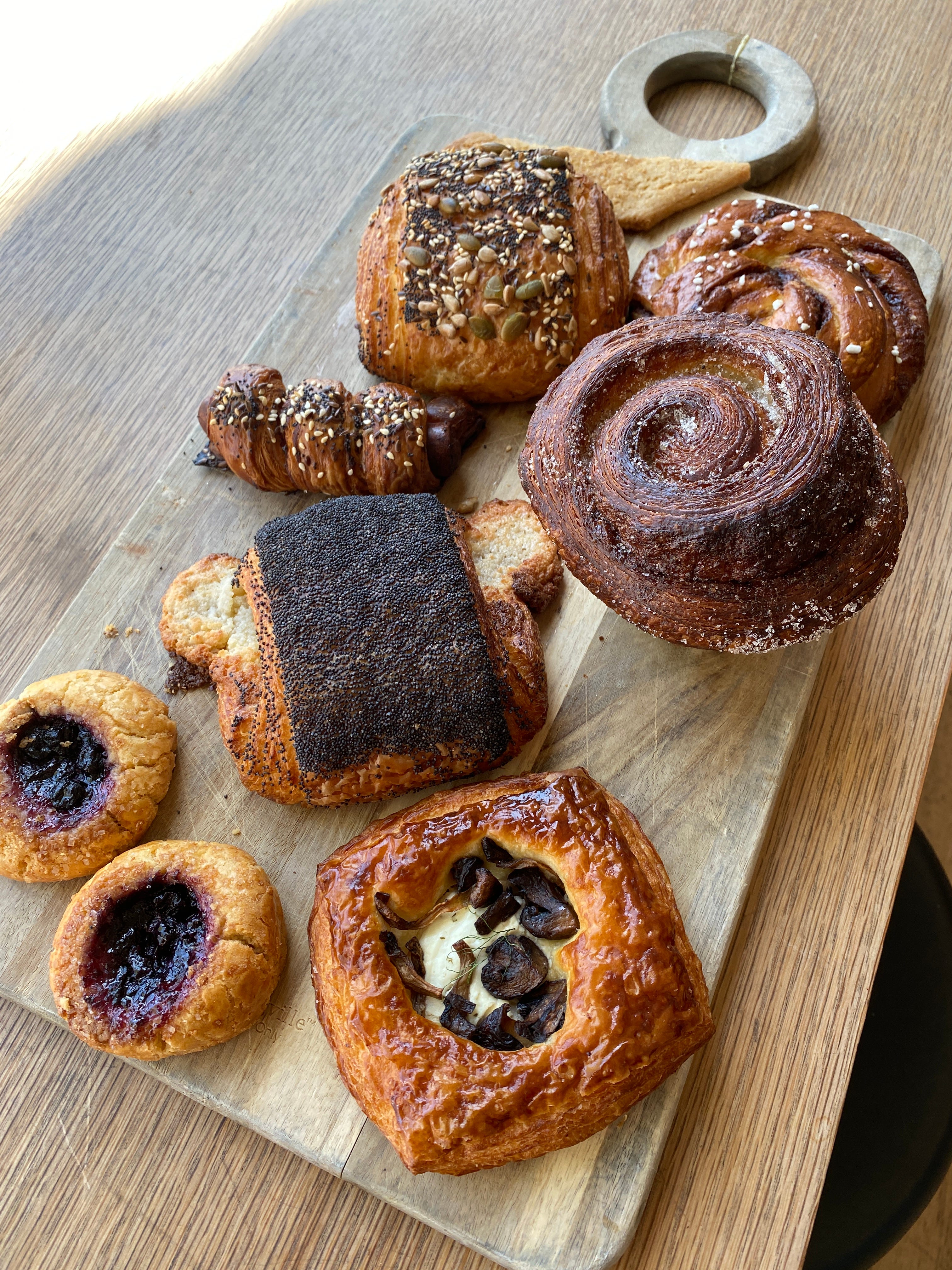 I had spectacular luck with I was in San Francisco and a friend suggested we meet up one morning at Kantine, a Scandinavian bakery and café. Arriving a little early, I was knocked out by the beautiful selection of pastries and breakfast offerings, which included open-faced smoked fish sandwiches on housemade sprouted rye bread, savory grain porridge, and a Scandinavian take on the breakfast sandwich, the Grovbirkes, a seed-crusted spiral of buttery puff pastry filled with warm scrambled eggs and crisp bacon. I wanted it all!