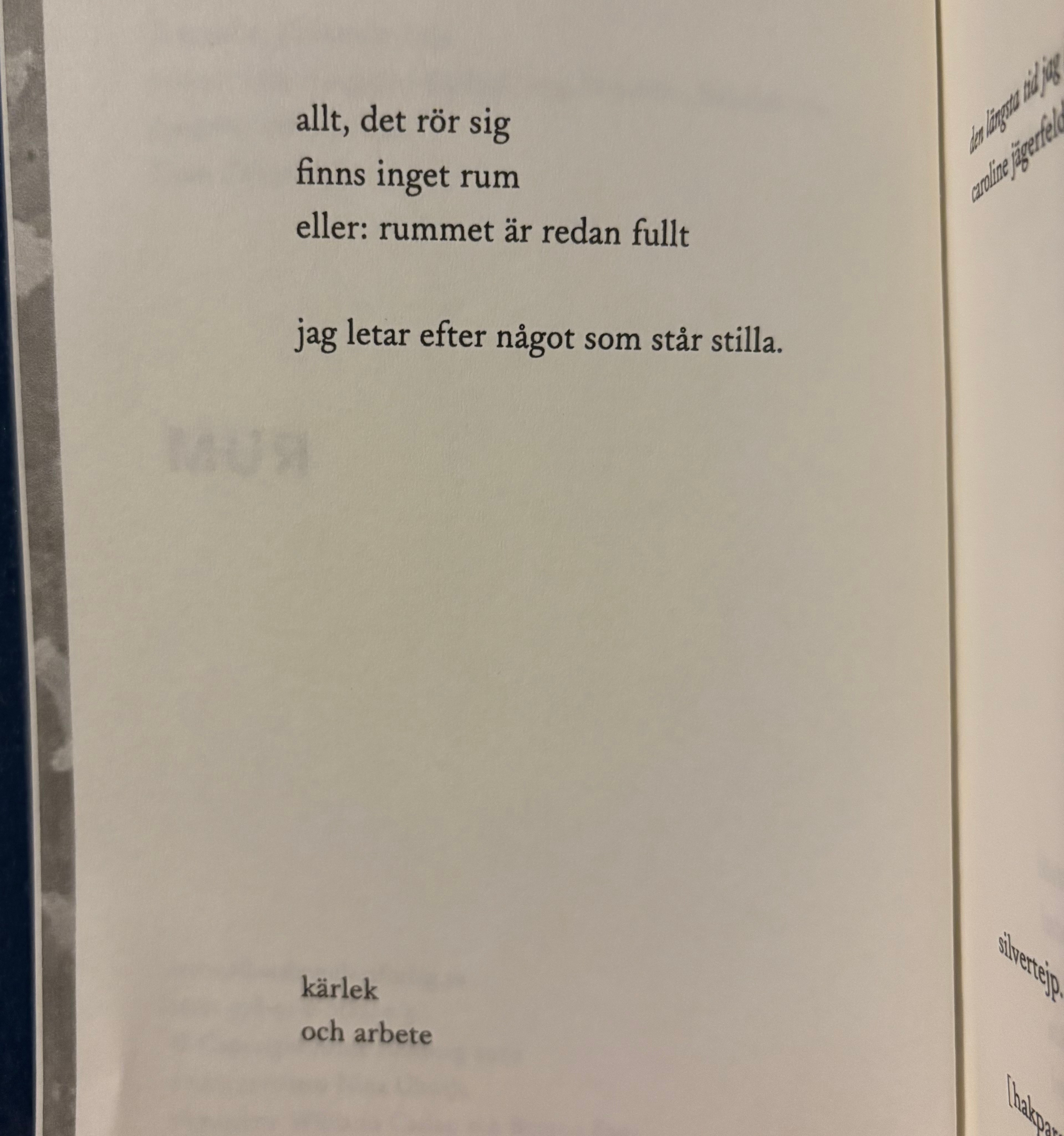Dikten går att tolka på massa sätt. Vi kan kasta in den här, på textens tillfälliga scen. Allt rör sig (hela tiden). Det finns inget rum eller rummet är redan fullt. Det är motsägelsefullt. Det är i alla fall oklart om det finns någon plats för dig eller mig. Något som är stilla. Det låter som en fast punkt, ett hem kanske. De många mellanslagen, det vita avståndet, hur kan vi tolka det? Poeten letar efter stillhet. Men det blir bara vitt. Jag tror inte hon hittar något. Eller kanske till slut… kärlek och arbete.