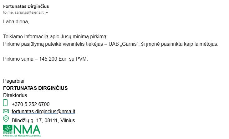 Šiame pirkime buvo pateiktas vienintelis tiekėjo pasiūlymas, tas tiekėjas buvo UAB “Garnis”. Už 145 200 eurų.