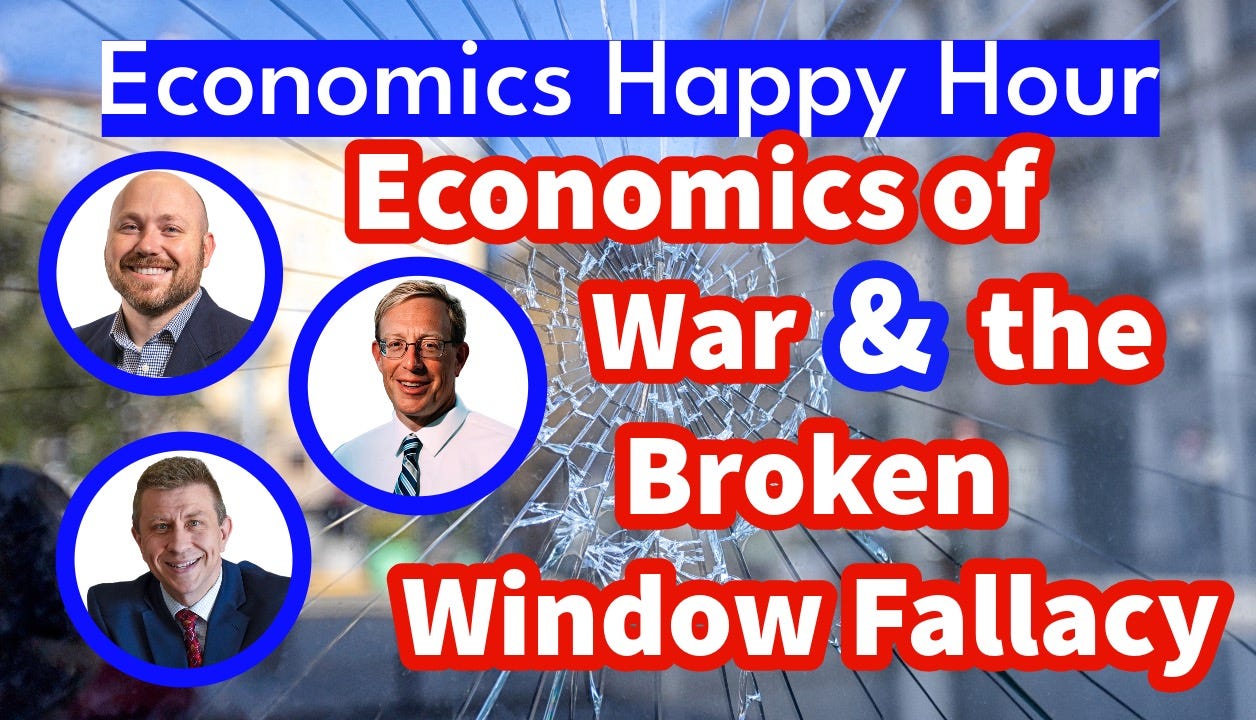 This week, Brian O’Roark joins the show again to help Matt & Jadrian discuss the economic concepts behind war and conflict. With the Russia-Ukraine war ongoing and the renewed conflict in the Middle East, the three of us decided it was time to talk about various concepts related to war and conflict. Most of the discussion focused on a concept known as the broken window fallacy, but we also ventured into conversations around rationing, inflation, GDP, and other ways that economists discuss war and conflict in their classes.