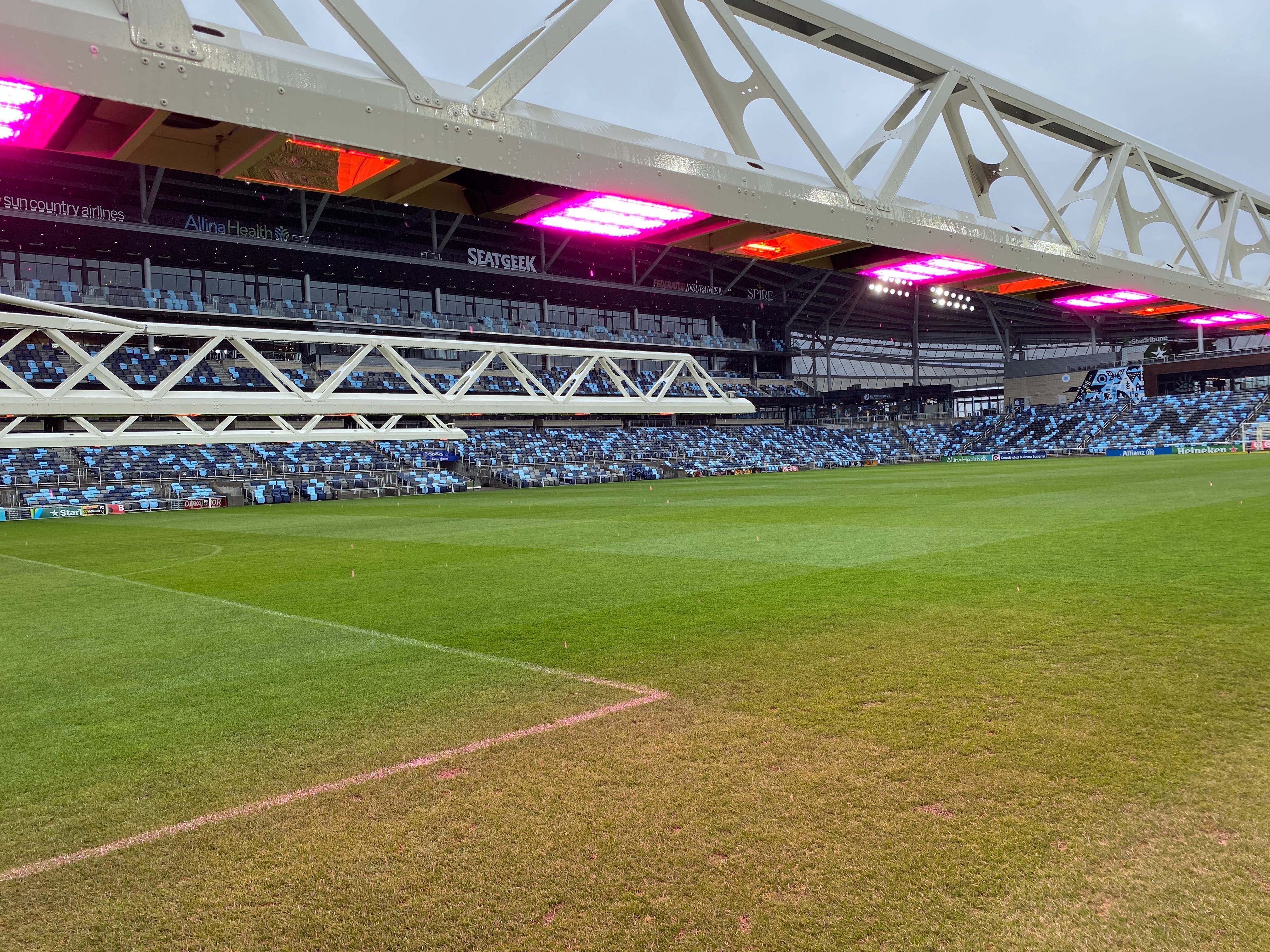 Clockwise from top left: Our recording studio at Allianz Field, the south end of the stadium gets a lot of shade from the roof, hybrid stitching visible in a wear area along the touch line, Ryan and team are testing LED grow-lights, they also include heat lamps, close up of the hybrid fibers