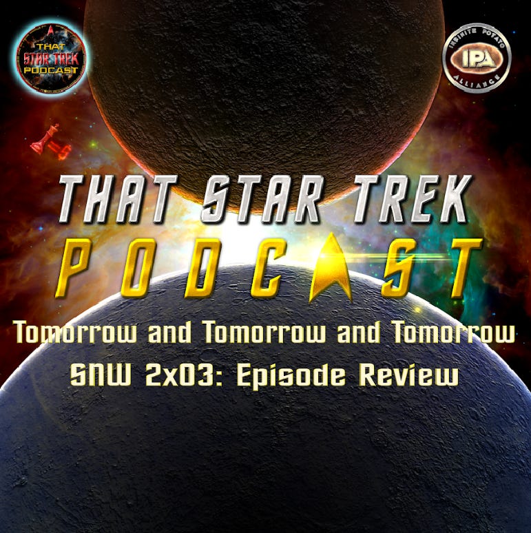 Star Trek is up to their old time travel tricks again. This time, a twist of wibbly wobbly fate has La’an travel back to 2022 along with a version of James T. Kirk to stop an alternate future from unfolding. Join us for our review of “Tomorrow and Tomorrow and Tomorrow.”