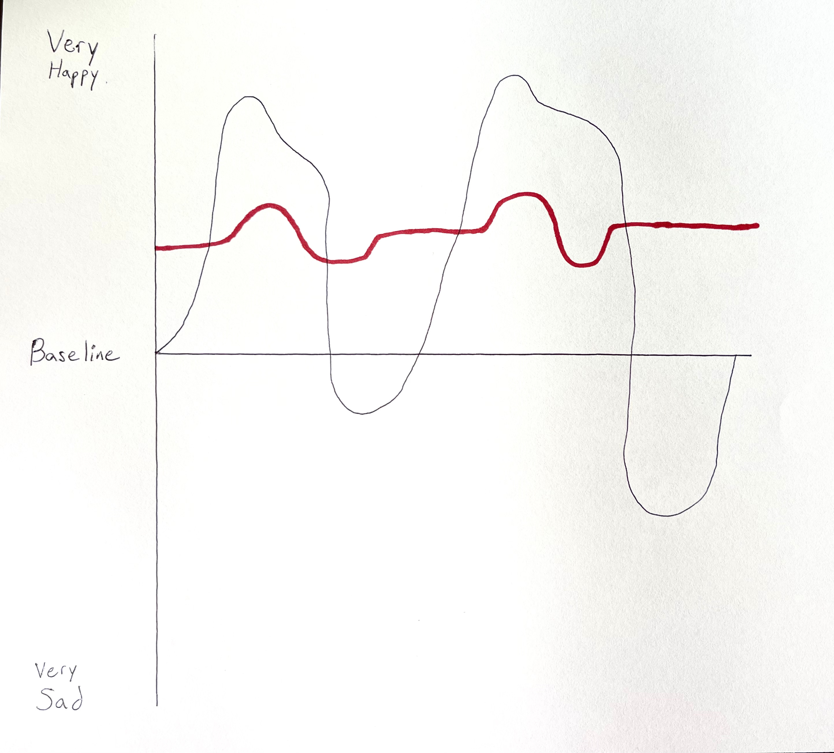 I've put together a rather simple yet effective graphic to encapsulate my feelings. The black line represents my emotional state during alcohol consumption. My first drink would spark a surge of happiness that lingered for a while before descending into a subtle sadness. The happiness spikes were exhilarating, even tempting me to justify the subsequent sadness. However, upon quitting alcohol, the happiness surge vanished, as did the following sadness. My overall happiness seemed slightly elevated in sobriety. But more importantly, my mood stabilized, no longer swinging between extreme highs and lows. My emotional regulation significantly improved.