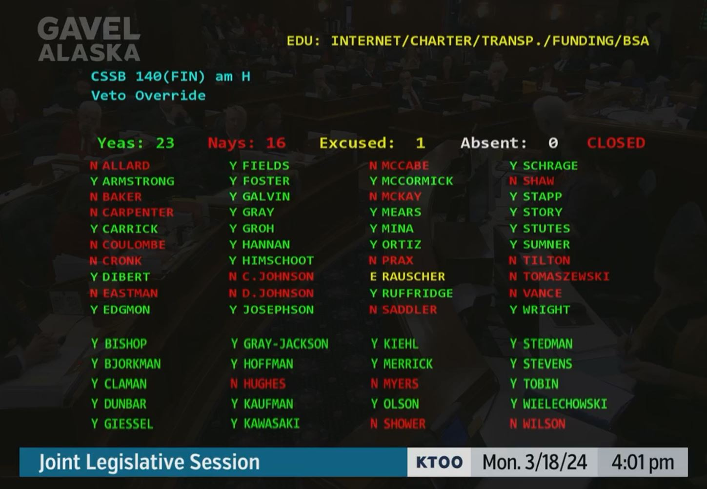Senate Bill 140 was truly bipartisan. It passed the Alaska House of Representatives on February 22 by a vote of 38-2 and passed the Alaska State Senate on February 26 by a vote of 18-1.