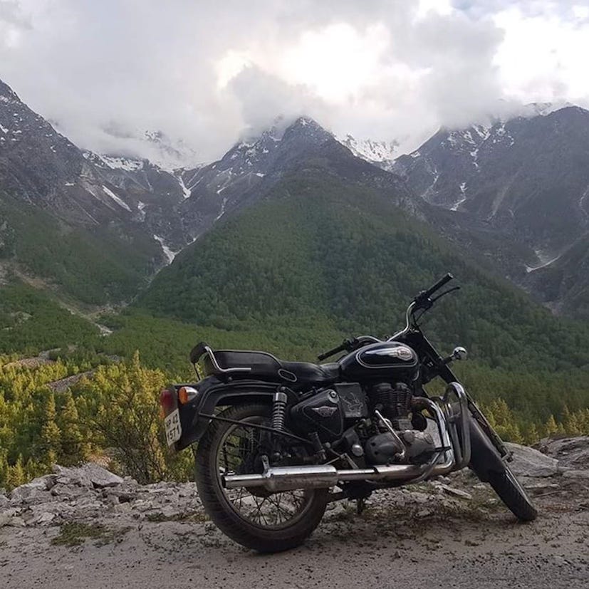My boyfriend and I took off on the motorbike, a Royal Enfield Bullet heavy with luggage, and purring. We headed first to meet his brother – also estranged until now – for a few nights of giant beetles flying into my hair and then north up the Western Ghats. The monsoon chased us. We’d mistimed our travels and no matter how fast we rode, the rains caught up. We stopped soaked and freezing in tea plantations, couldn’t undo the swollen ropes that tied our soaking gear to the bike, slept in roadside rooms fully clothed, never time to dry off. In Goa we looked for the parties that had already moved north. At the Taj Mahal we sat on marble away from each other. In Delhi we put on helmets and couldn’t see for moths. In Rajasthan we fell in love with green-eyed women and crashed the bike in sand. In Chandigarh we slept in a barn with twenty men, one of whom put his hand down my jeans again and again until I woke my boyfriend up and told him we had to leave. He agreed, but grudgingly; we weren’t friends, he and I. Already we were unhappy. From the night he unfolded the story of his kidnap to the last dusty road to his mother’s house had been a matter of months. We’d left England on an impulse, no plan except to find her. And we were children; we hardly knew ourselves let alone each other. At a chai stop in the foothills of the Himalayas we met an Israeli couple who invited us to stay. They had a Royal Enfield too. It had got us talking. We followed them, two Bullets chugging up the winding narrow roads of the valley towards Manali, the great drop to our right, the apple trees bending in the light, sudden rainbows bowing to drink from the river crashing below. They parked at a cow shed above which were some rooms. We followed them up the wooden steps. He cooked a meal on a camping stove, tomatoes, onions and green peppers. She unfolded their clothes and made the bed. We ate and then they gave us acid and suggested an orgy. I remember thinking, How revolting. My boyfriend also declined. We went to bed listening to them laughing. The next day a friend of theirs arrived, the most beautiful man I’d ever seen; tendrils of dark hair, a soft pink shirt, faded jeans, he sat cross-legged on the floor and passed me a chillum. My boyfriend went out to get food. When he came back, he found us together. I gave him only the most fleeting of goodbyes. He took the bike.