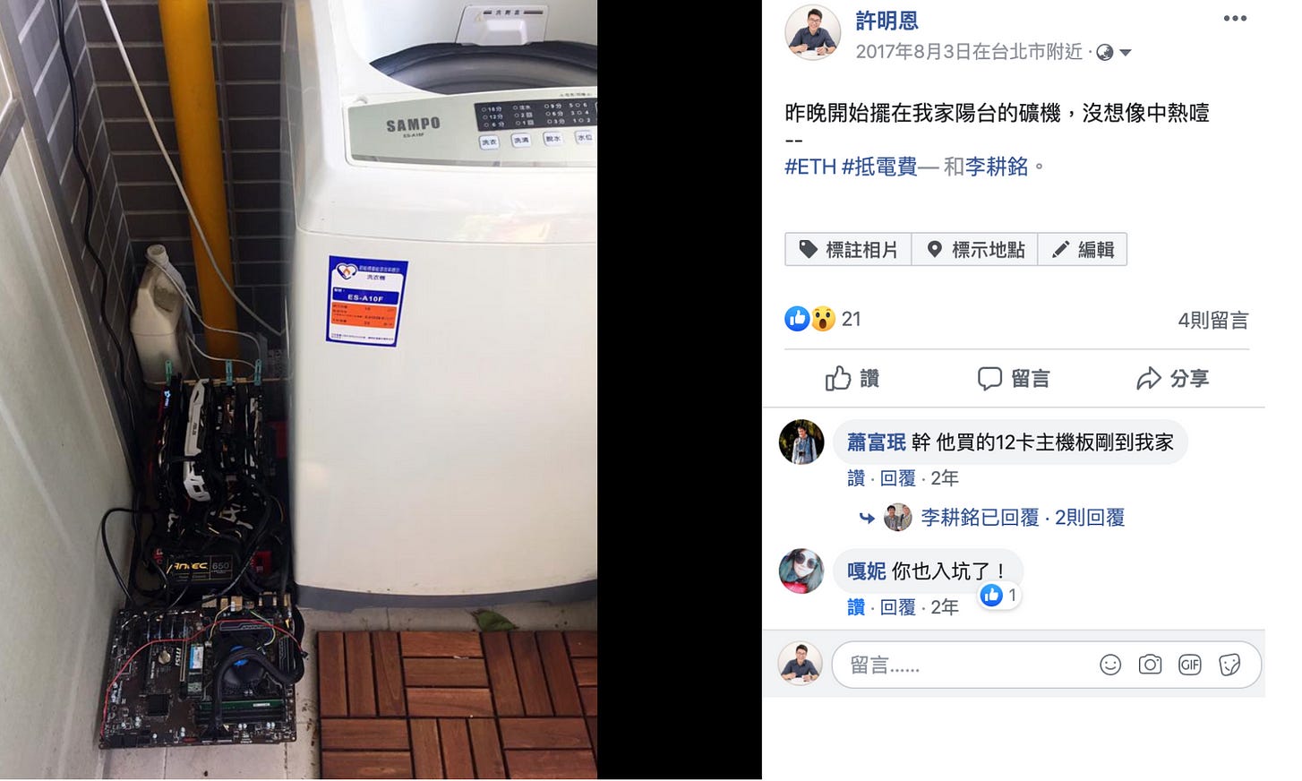 實際接觸過挖礦的人少之又少,下方是曾經放在我家的以太幣挖礦機(洗衣機左方):