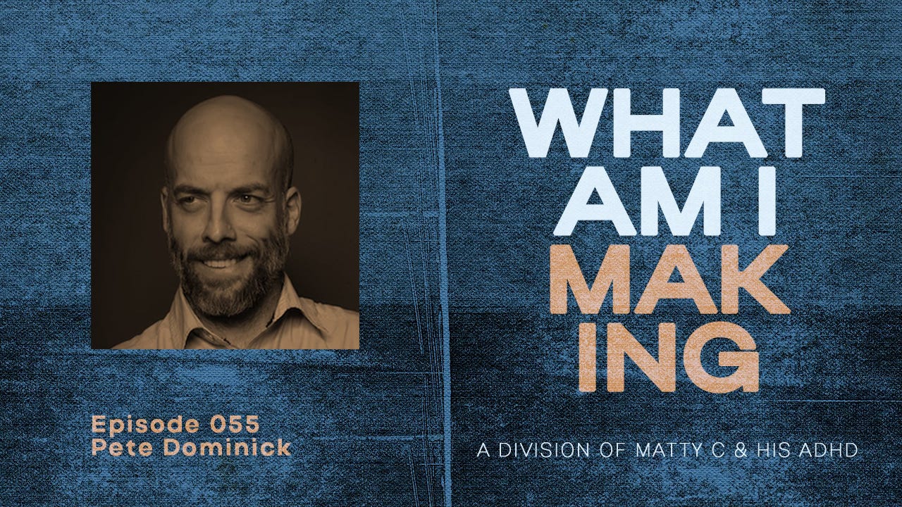 Pete Dominick was an inspiration for me when I began What Am I Making. Before I started publishing, I reached out to Pete and asked for his advice. He encouraged me to begin the work and figure out what it all meant afterward. Pete encouraged me to stay in the moment and to enjoy the process. I took his advice and I ran with it.