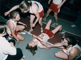 Lying on the track is Leslie Gold, collapsed at the end of the 800-metre relay race, won last month by Gold, and, from left to right, Elaine Penny, Carly Moher and Stephanie Welsh. Earlier that day, Gold didn't complete two events, due to an asthma attack but rallied her strength to compete in the relay. This is the second year in a row that McGill has won the event at the Canadian Inter-University Athletic Union Track and Field Championships. All four women were named All Canadians by the CIAU.
